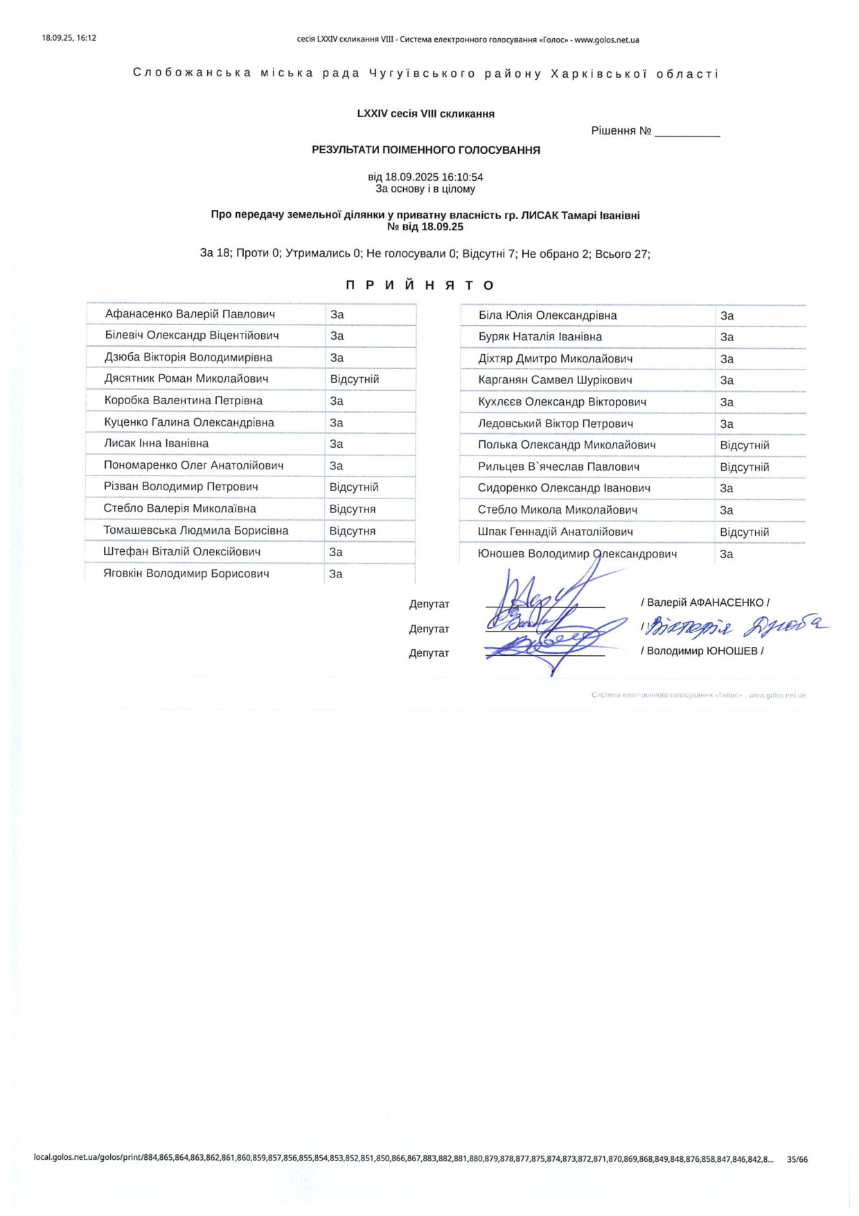 Відомості голосування до рішення сесії №3194 Про передачу земельної ділянки у приватну власність гр. ЛИСАК Тамарі Іванівні.