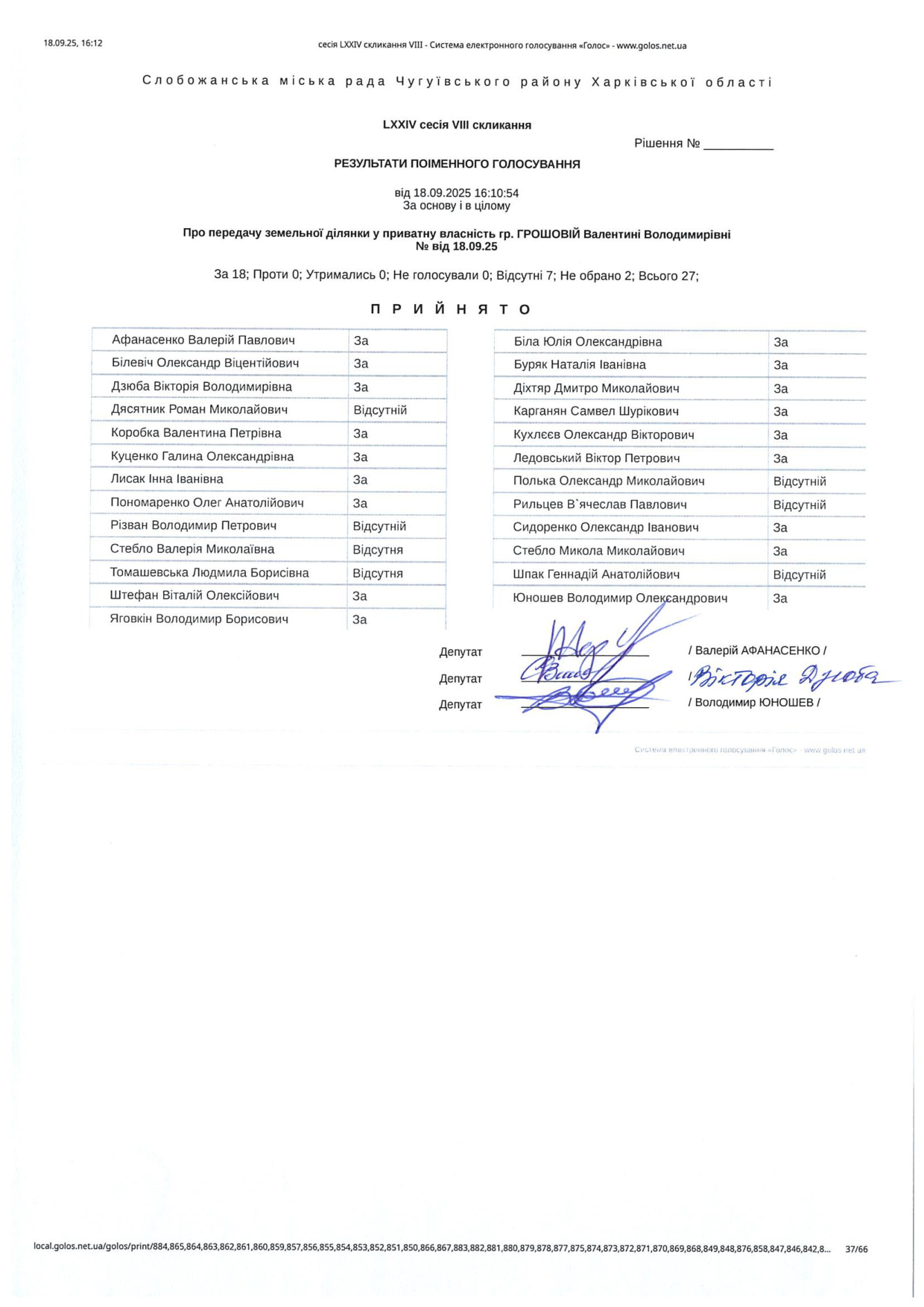 Відомості голосування до рішення сесії №3196 Про передачу земельної ділянки у приватну власність гр. ГРОШОВІЙ Валентині Володимирівні.