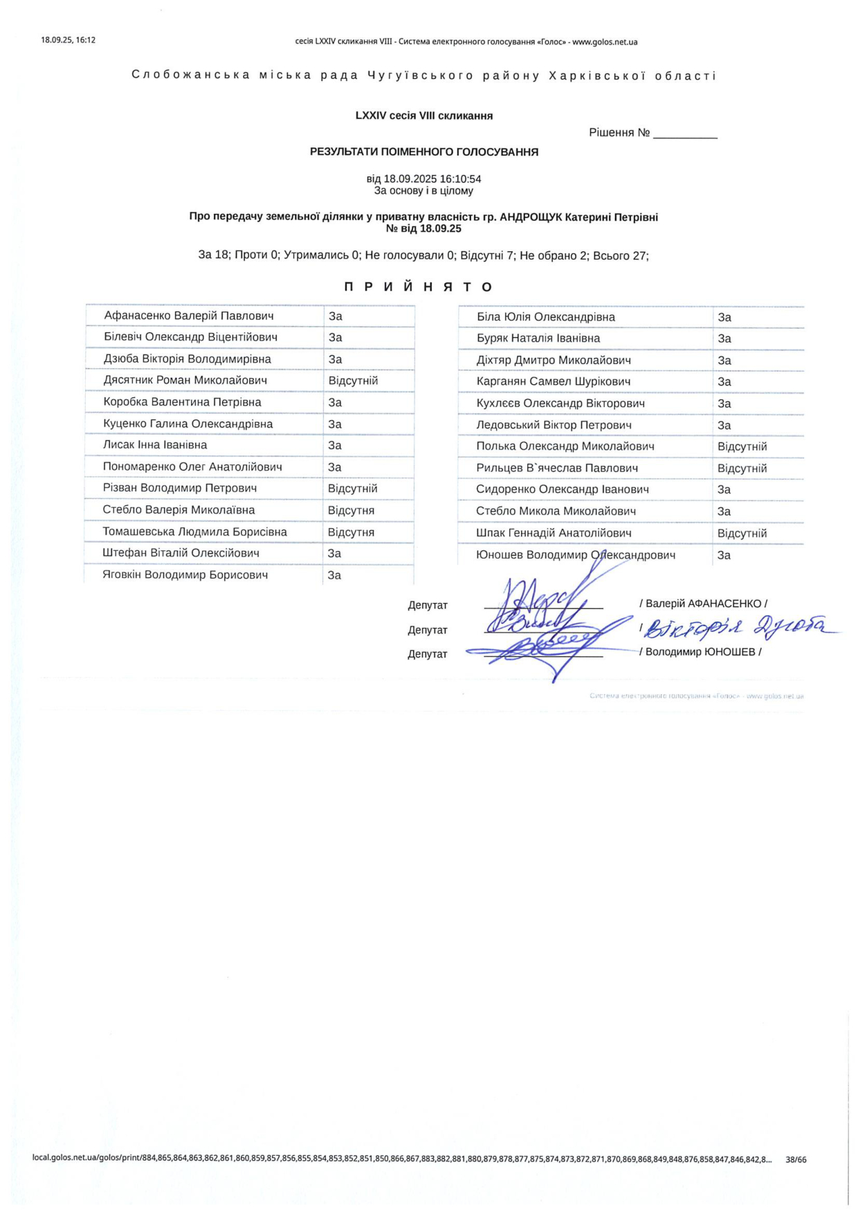 Відомості голосування до рішення сесії №3197 Про передачу земельної ділянки у приватну власність гр. АНДРОЩУК Катерині Петрівні.