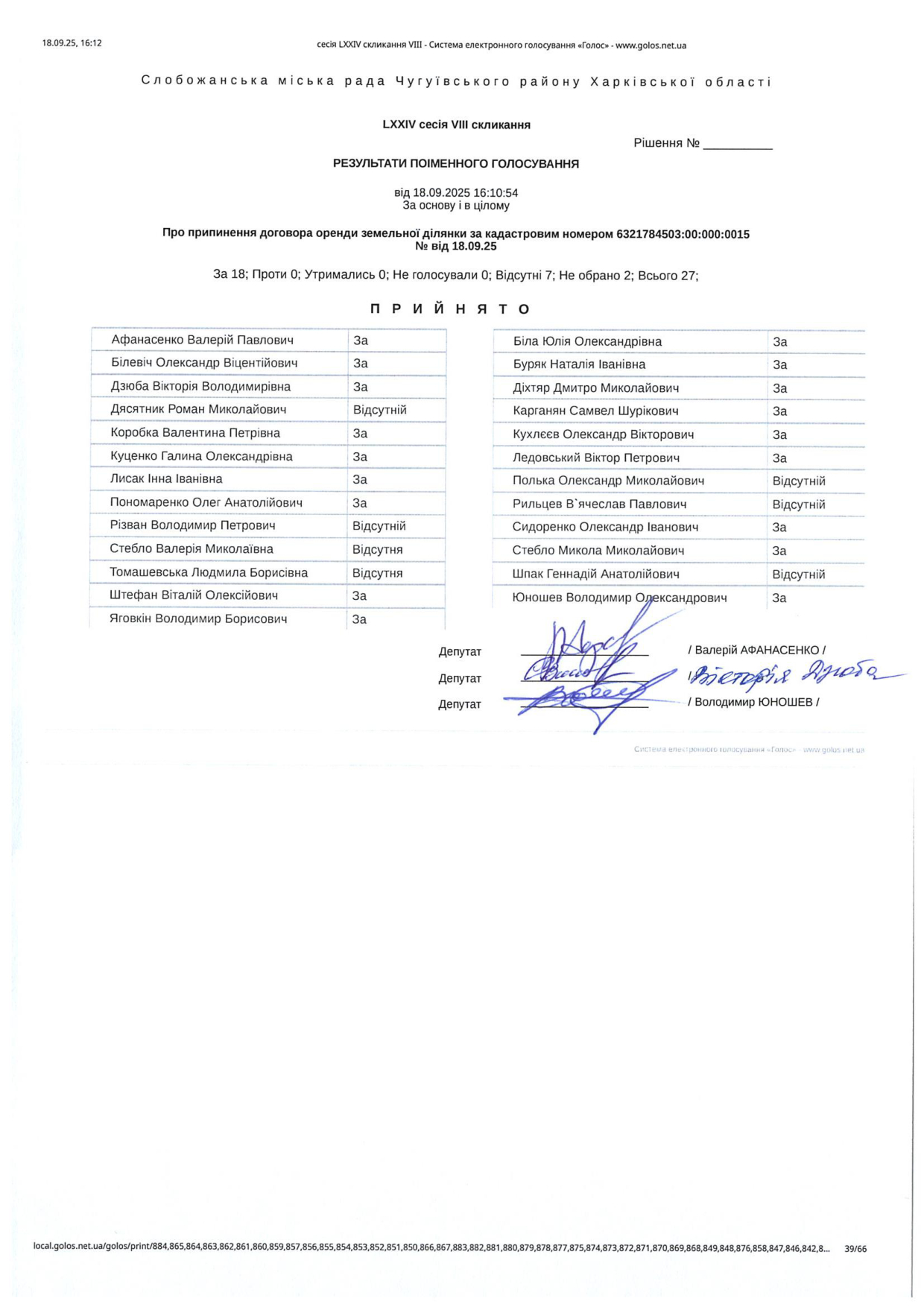Відомості голосування до рішення сесії №3198 Про припинення договора оренди земельної ділянки за кадастровим номером 6321784503:00:000:0015.