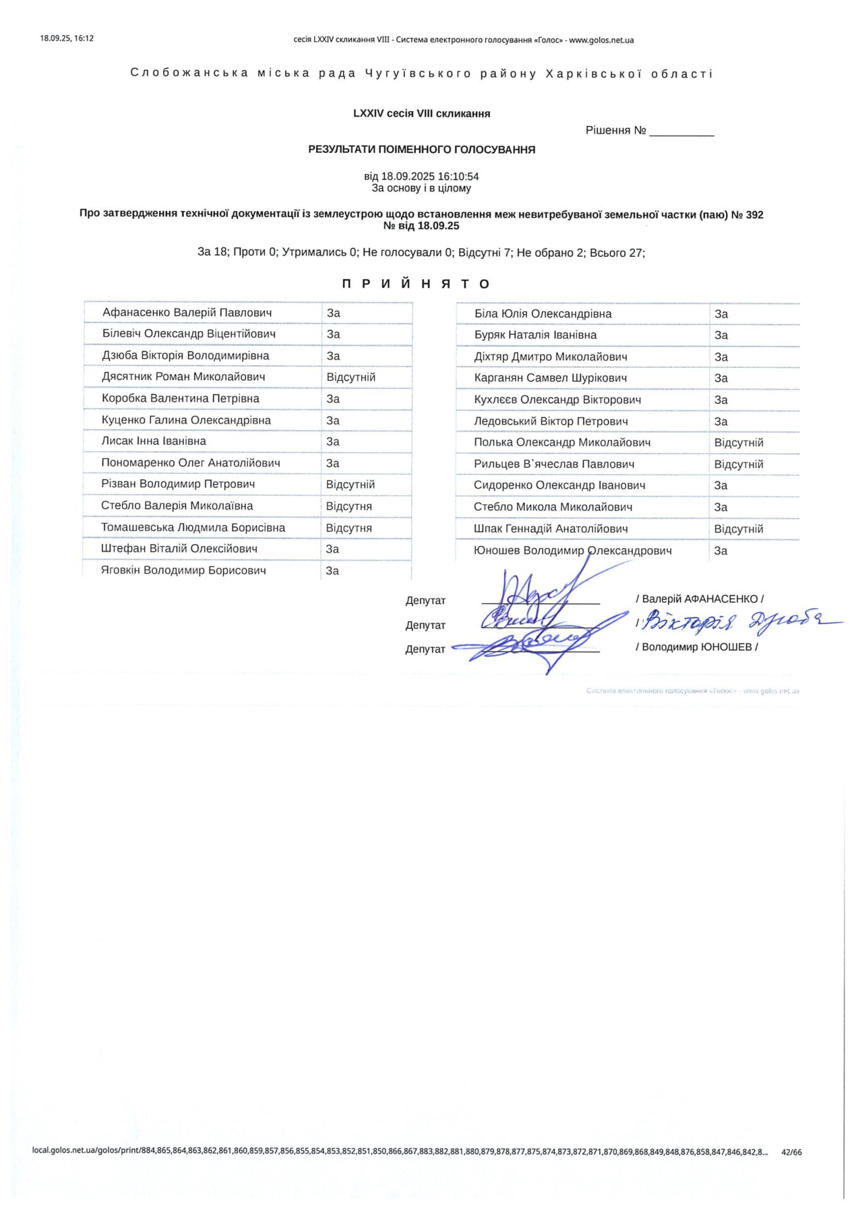 Відомості голосування до рішення сесії №3201 Про затвердження технічної документації із землеустрою щодо встановлення меж невитребуваної земельної частки (паю) № 392.