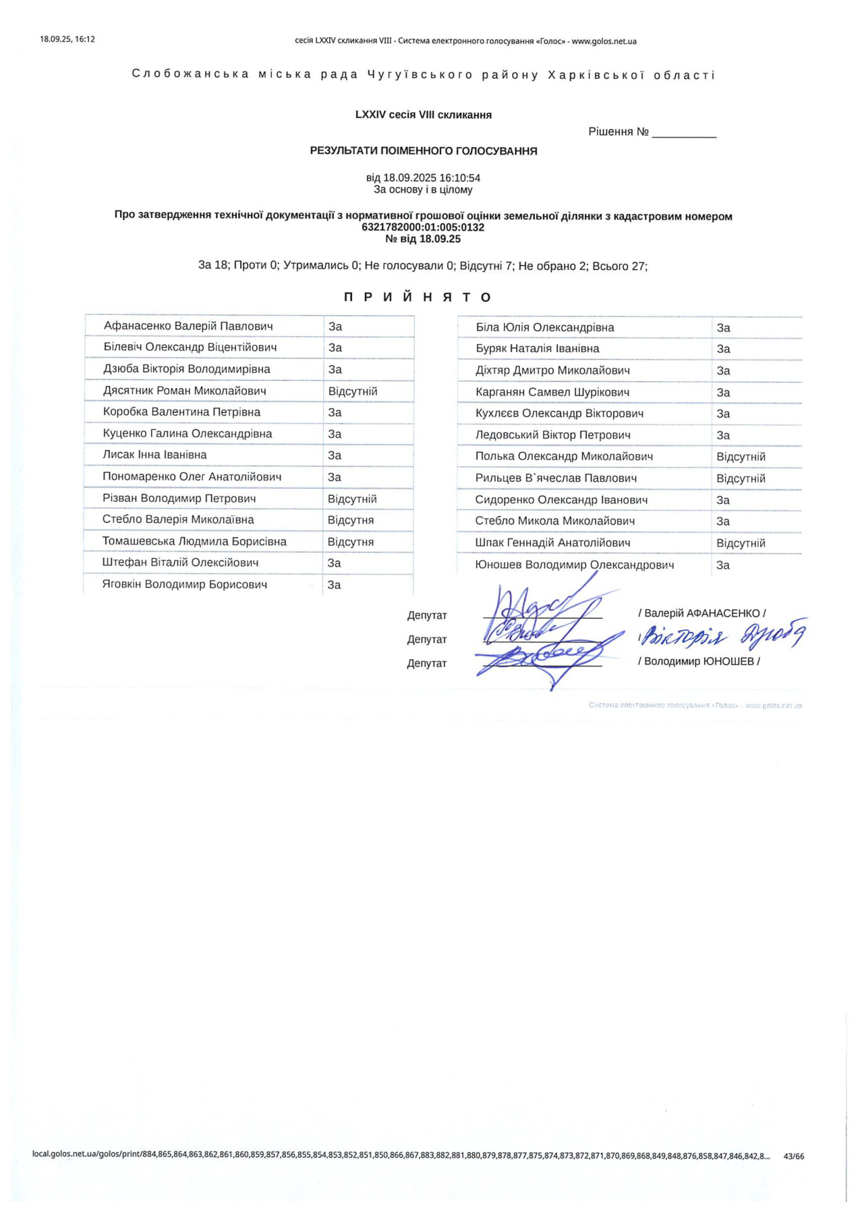 Відомості голосування до рішення сесії №3202 Про затвердження технічної документації з нормативної грошової оцінки земельної ділянки з кадастровим номером 6321782000:01:005:0132.