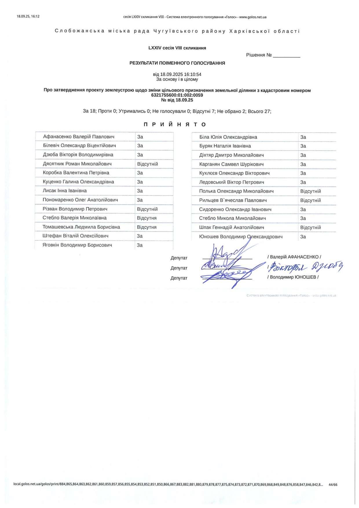 Відомості голосування до рішення сесії №3203 Про затвердження проекту землеустрою щодо зміни цільового призначення земельної ділянки з кадастровим номером 6321755600:01:002:0059.