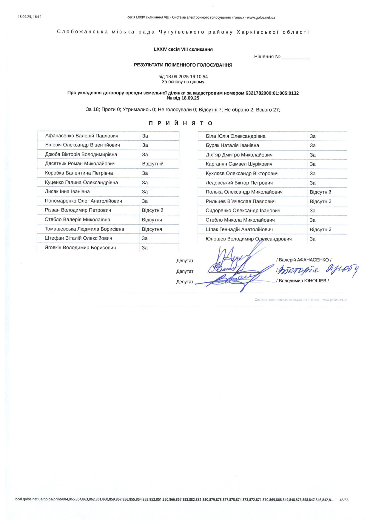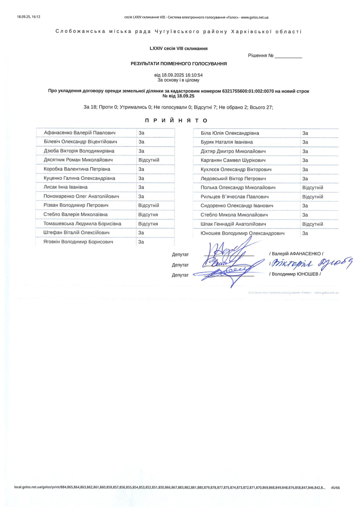 Відомості голосування до рішення сесії №3204 Про укладення договору оренди земельної ділянки за кадастровим номером 6321755600:01:002:0070 на новий строк.