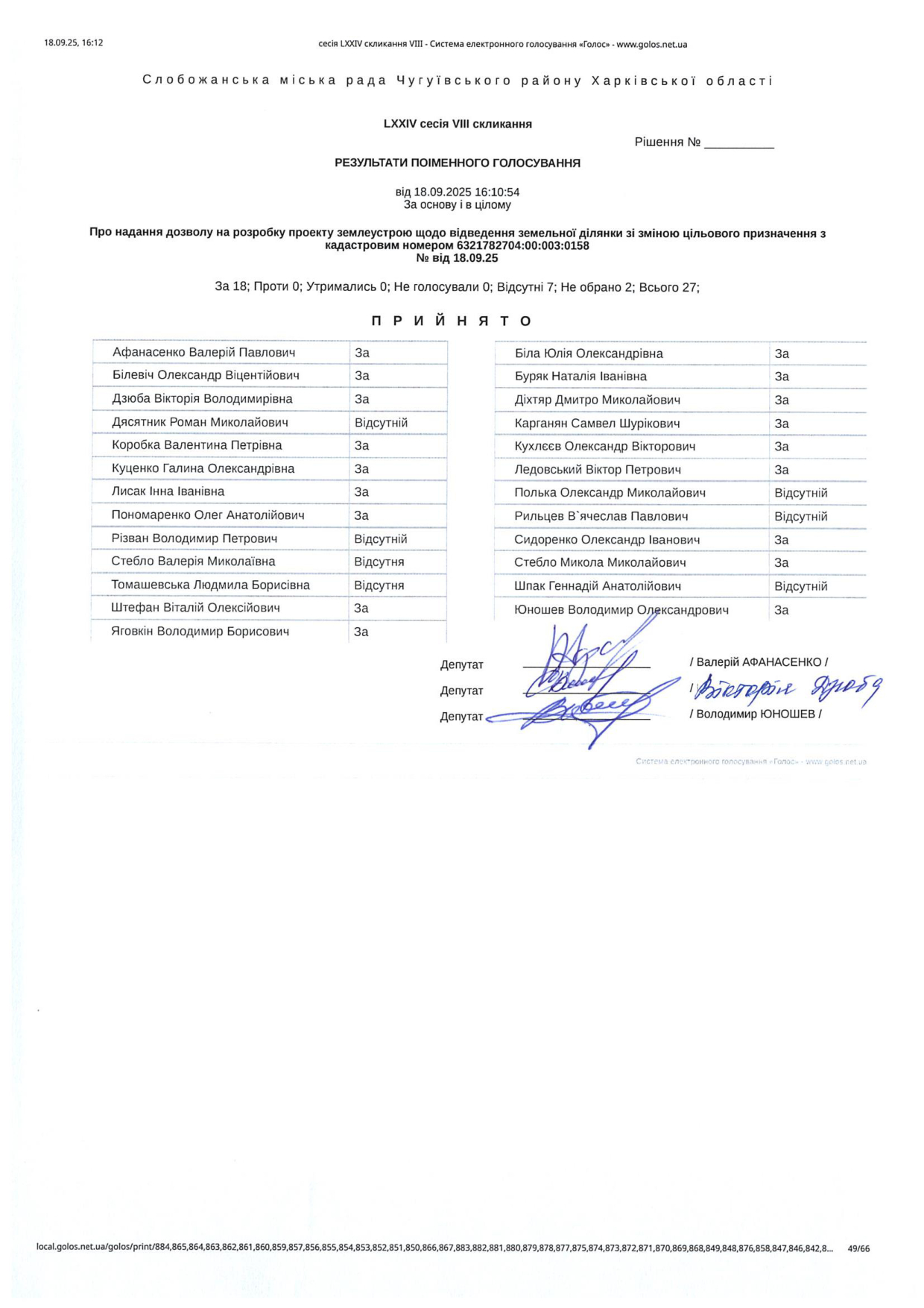 Відомості голосування до рішення сесії №3208 Про надання дозволу на розробку проекту землеустрою щодо відведення земельної ділянки зі зміною цільового призначення з кадастровим номером 6321782704:00:003:0158.