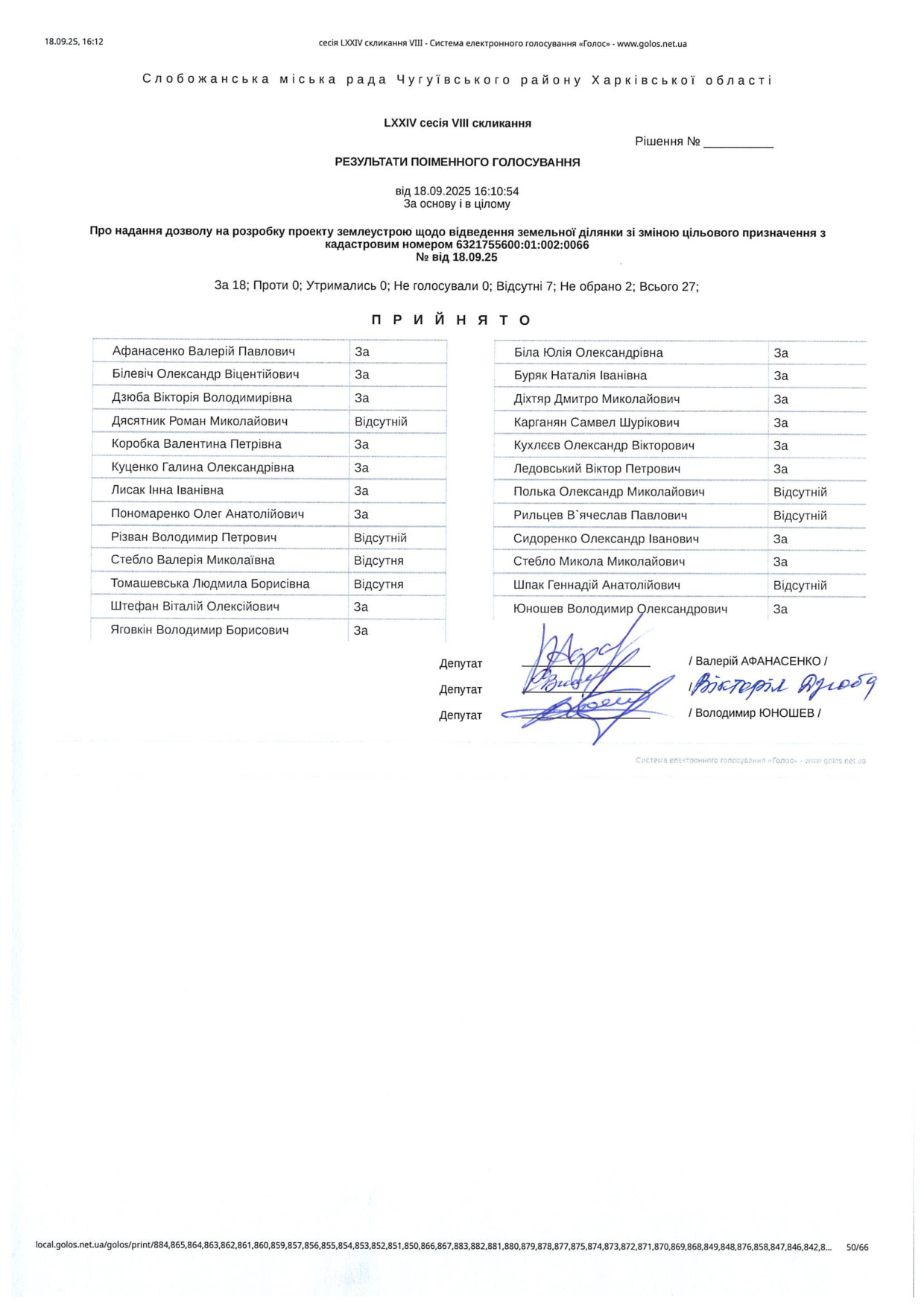 Відомості голосування до рішення сесії №3209 Про надання дозволу на розробку проекту землеустрою щодо відведення земельної ділянки зі зміною цільового призначення з кадастровим номером 6321755600:01:002:0066.