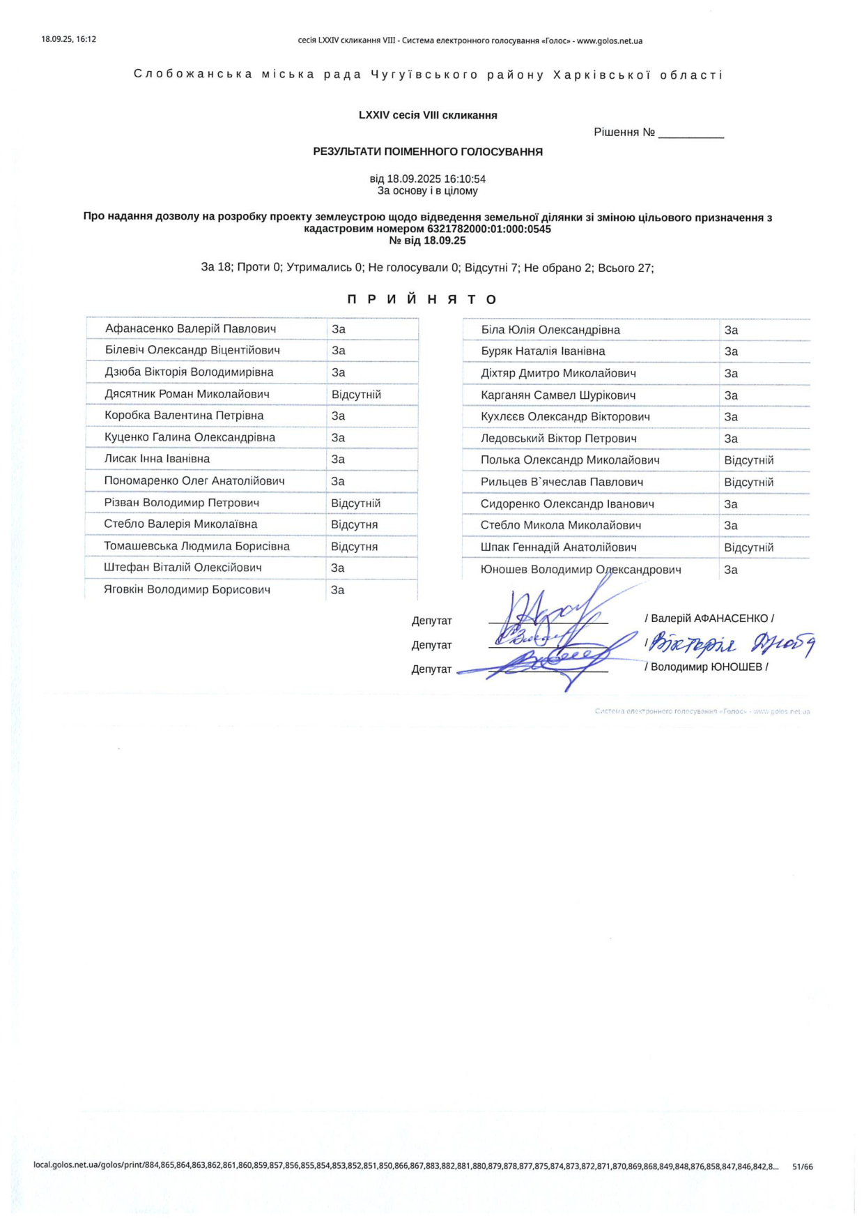 Відомості голосування до рішення сесії №3210 Про надання дозволу на розробку проекту землеустрою щодо відведення земельної ділянки зі зміною цільового призначення з кадастровим номером 6321782000:01:000:0545.