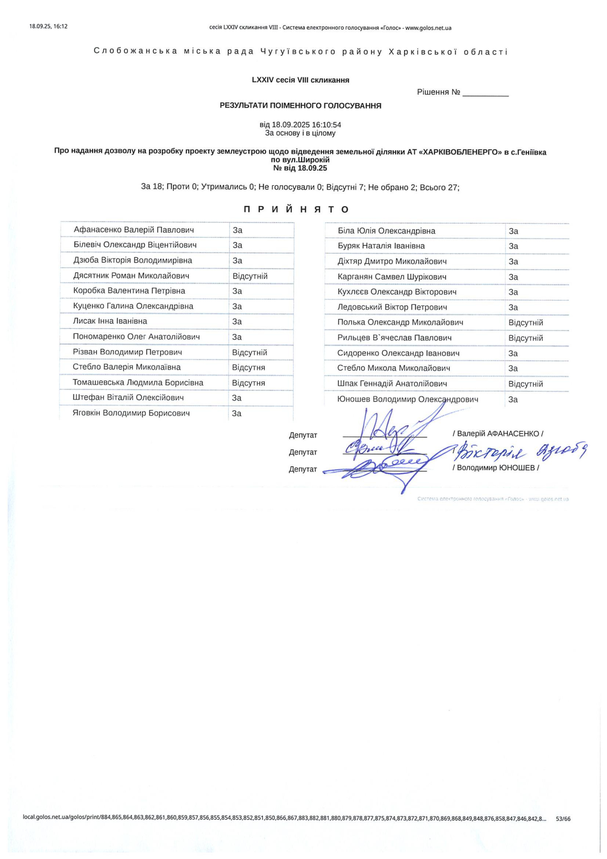 Відомості голосування до рішення сесії №3212 Про надання дозволу на розробку проекту землеустрою щодо відведення земельної ділянки АТ «ХАРКІВОБЛЕНЕРГО» в с.Геніївка по вул.Широкій.