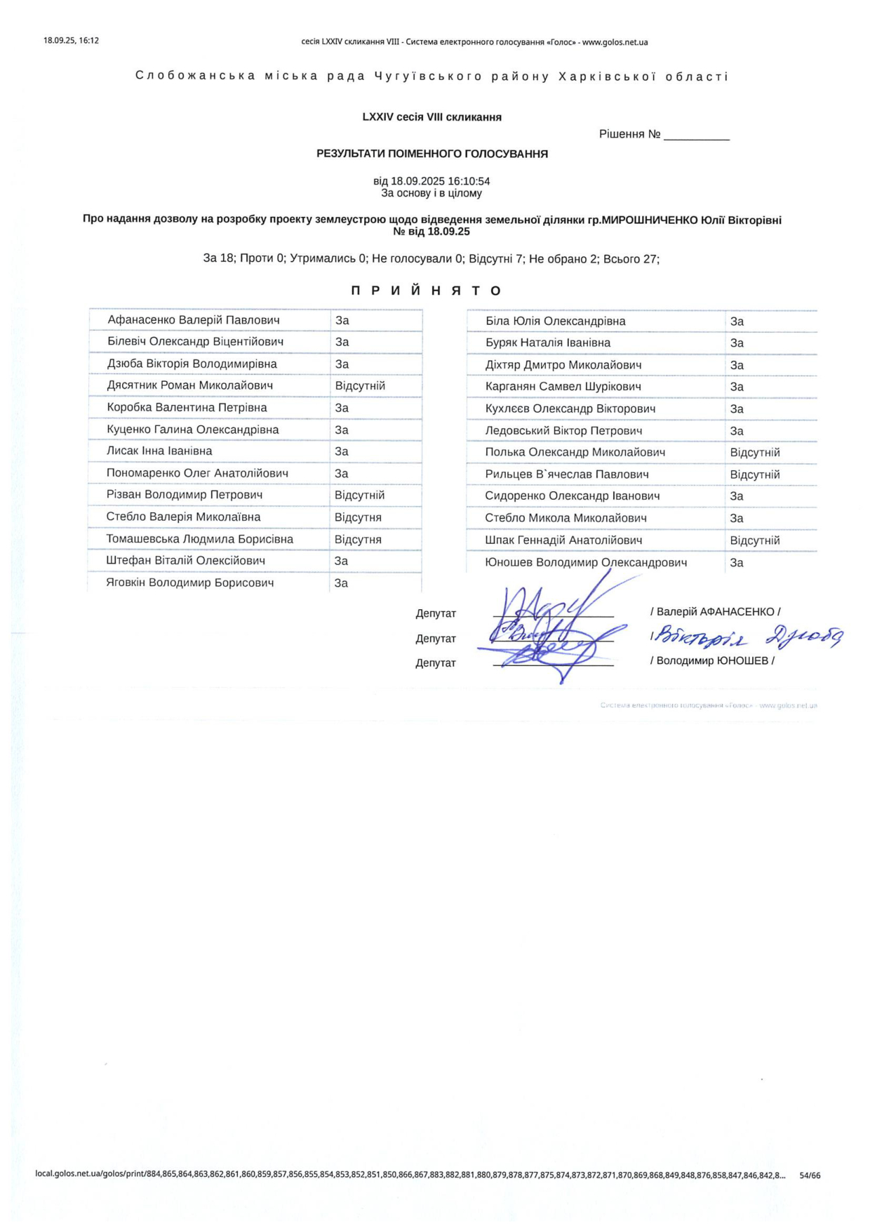 Відомості голосування до рішення сесії №3213 Про надання дозволу на розробку проекту землеустрою щодо відведення земельної ділянки гр.МИРОШНИЧЕНКО Юлії Вікторівні.