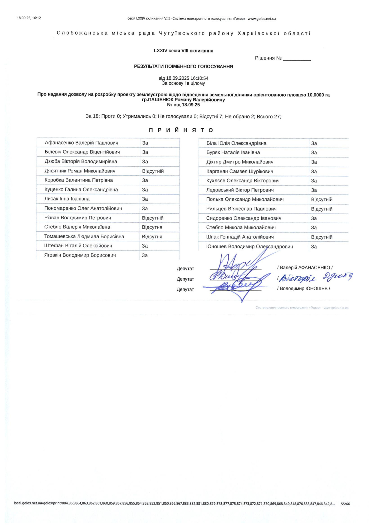 Відомості голосування до рішення сесії №3214 Про надання дозволу на розробку проекту землеустрою щодо відведення земельної ділянки орієнтованою площею 10,0000 га гр.ПАШЕНЮК Роману Валерійовичу.