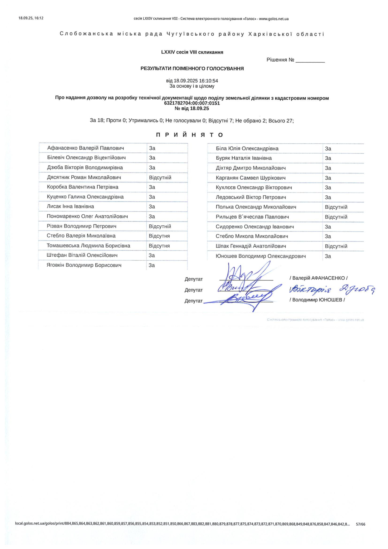 Відомості голосування до рішення сесії №3216 Про надання дозволу на розробку технічної документації щодо поділу земельної ділянки з кадастровим номером 6321782704:00:007:0151.
