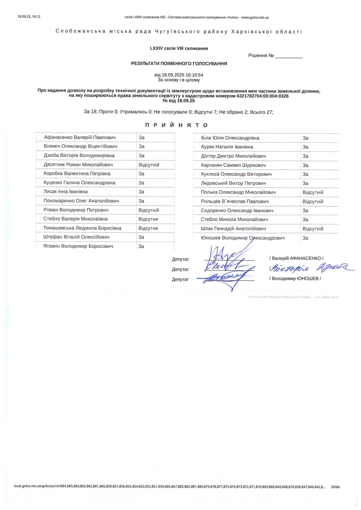 Відомості голосування до рішення сесії №3218 Про надання дозволу на розробку технічної документації із землеустрою щодо встановлення меж частини земельної ділянки, на яку поширюються права земельного сервітуту з кадастровим номером 6321782704:00:004:0326.