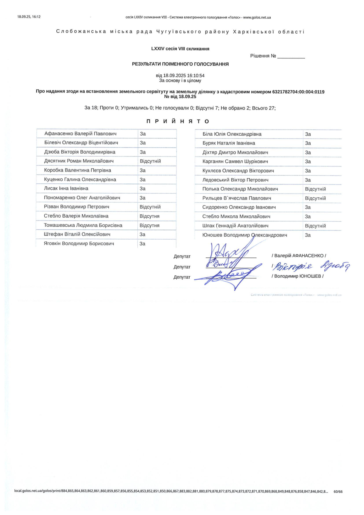 Відомості голосування до рішення сесії №3219 Про надання згоди на встановлення земельного сервітуту на земельну ділянку з кадастровим номером 6321782704:00:004:0119.