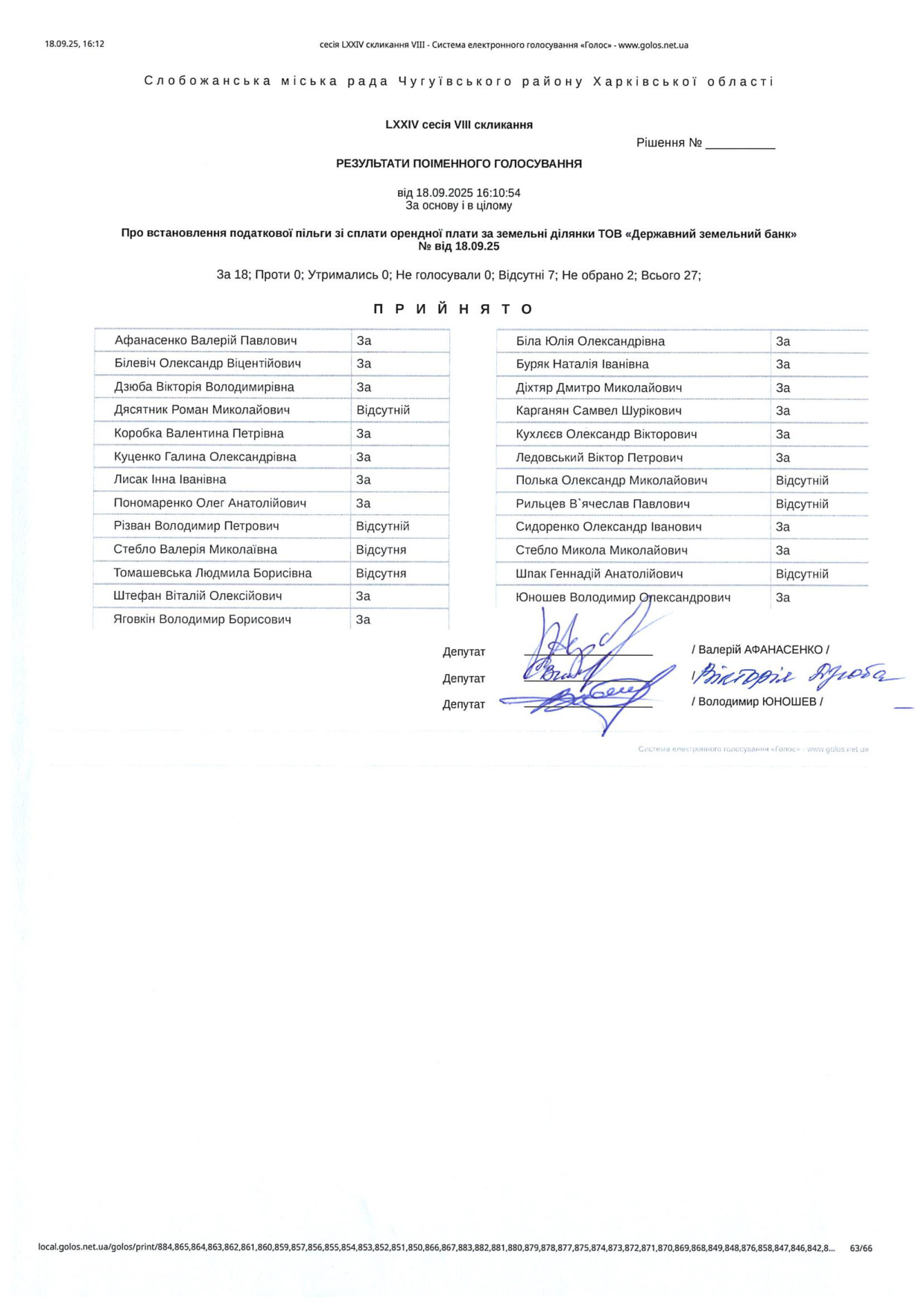 Відомості голосування до рішення сесії №3222 Про встановлення податкової пільги зі сплати орендної плати за земельні ділянки ТОВ «Державний земельний банк».