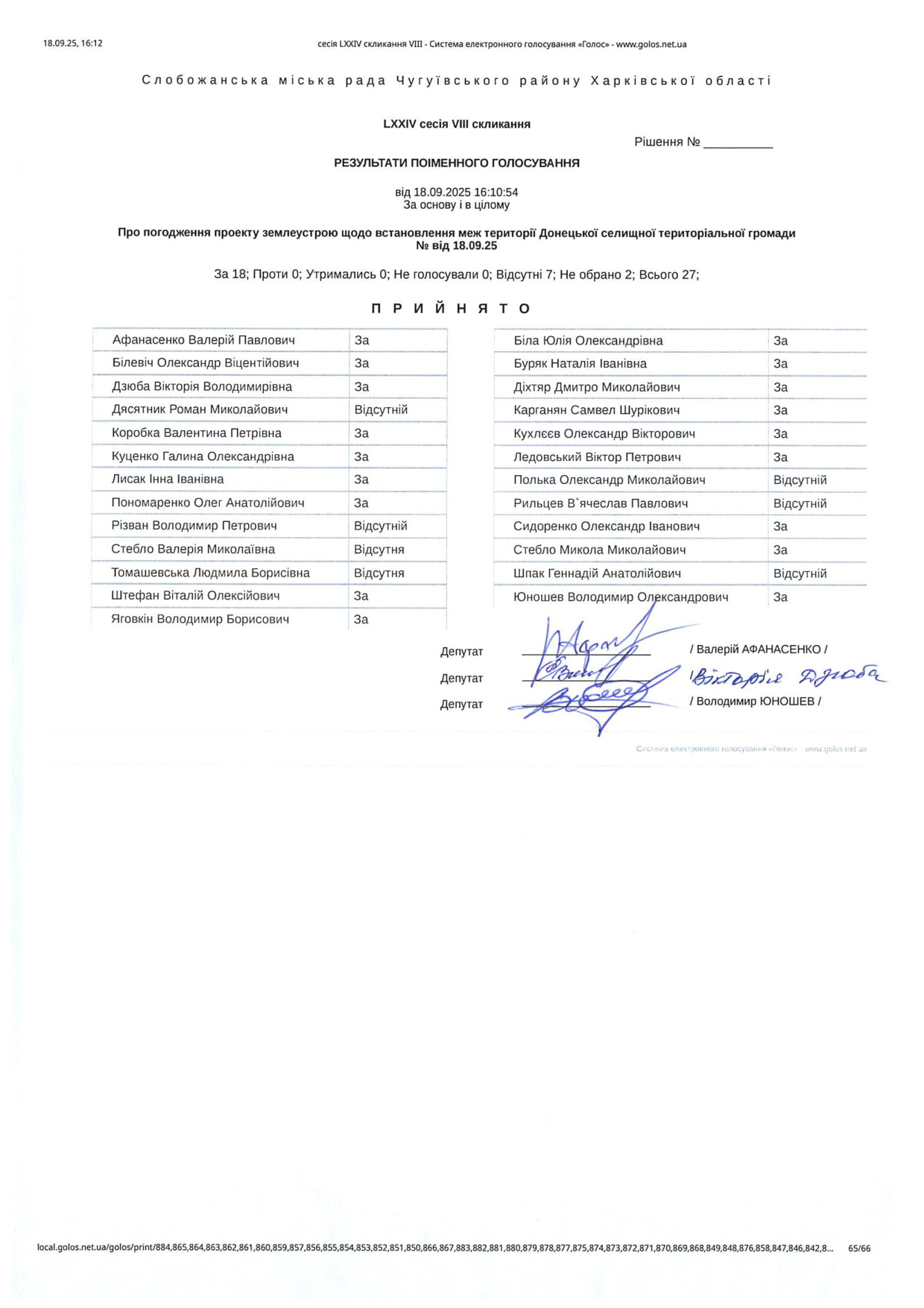Відомості голосування до рішення сесії №3224 Про погодження проекту землеустрою щодо встановлення меж території Донецької селищної територіальної громади.