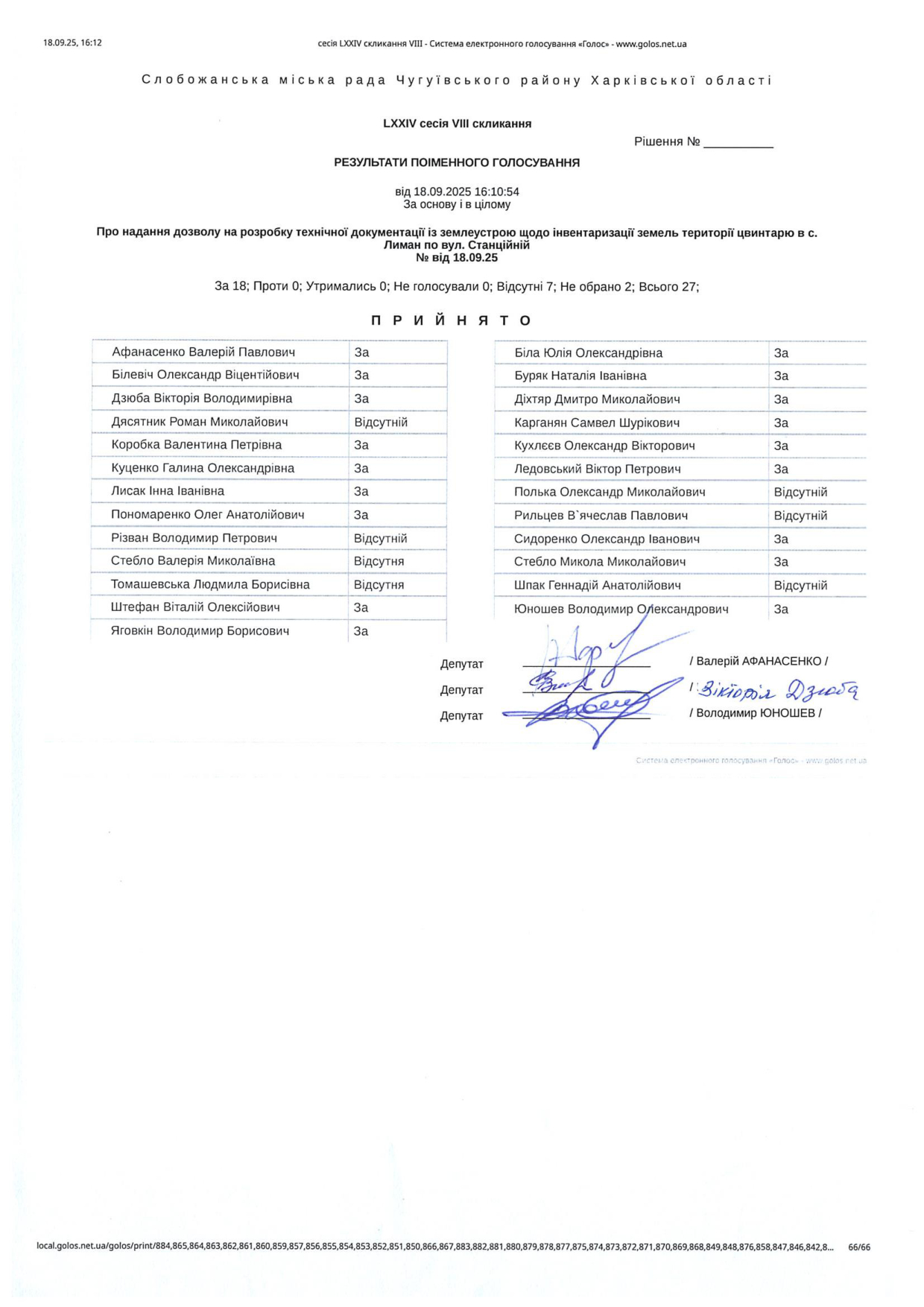 Відомості голосування до рішення сесії №3225 Про надання дозволу на розробку технічної документації із землеустрою щодо інвентаризації земель території цвинтарю в с. Лиман по вул. Станційній.