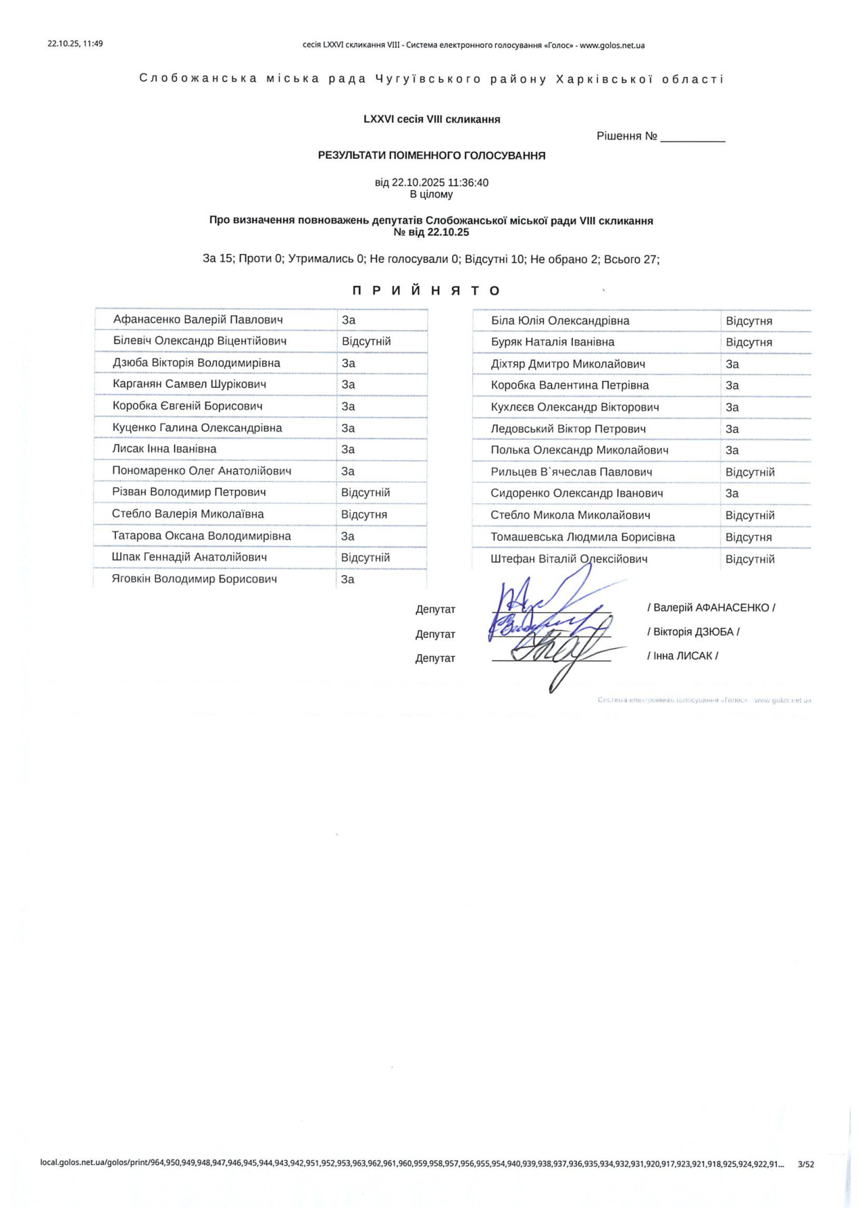 Відомості голосування до рішення сесії №3232 Про визначення повноважень депутатів Слобожанської міської ради VІІІ скликання.