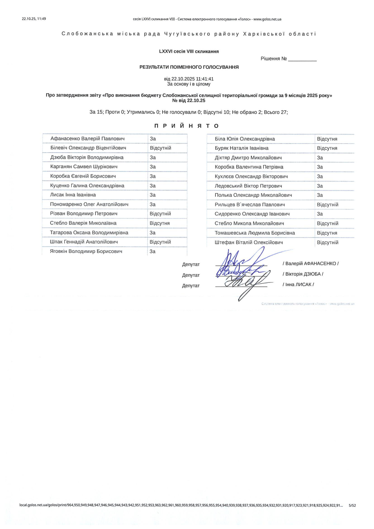Відомості голосування до рішення сесії №3234 Про затвердження звіту «Про виконання бюджету Слобожанської селищної територіальної громади за 9 місяців 2025 року».