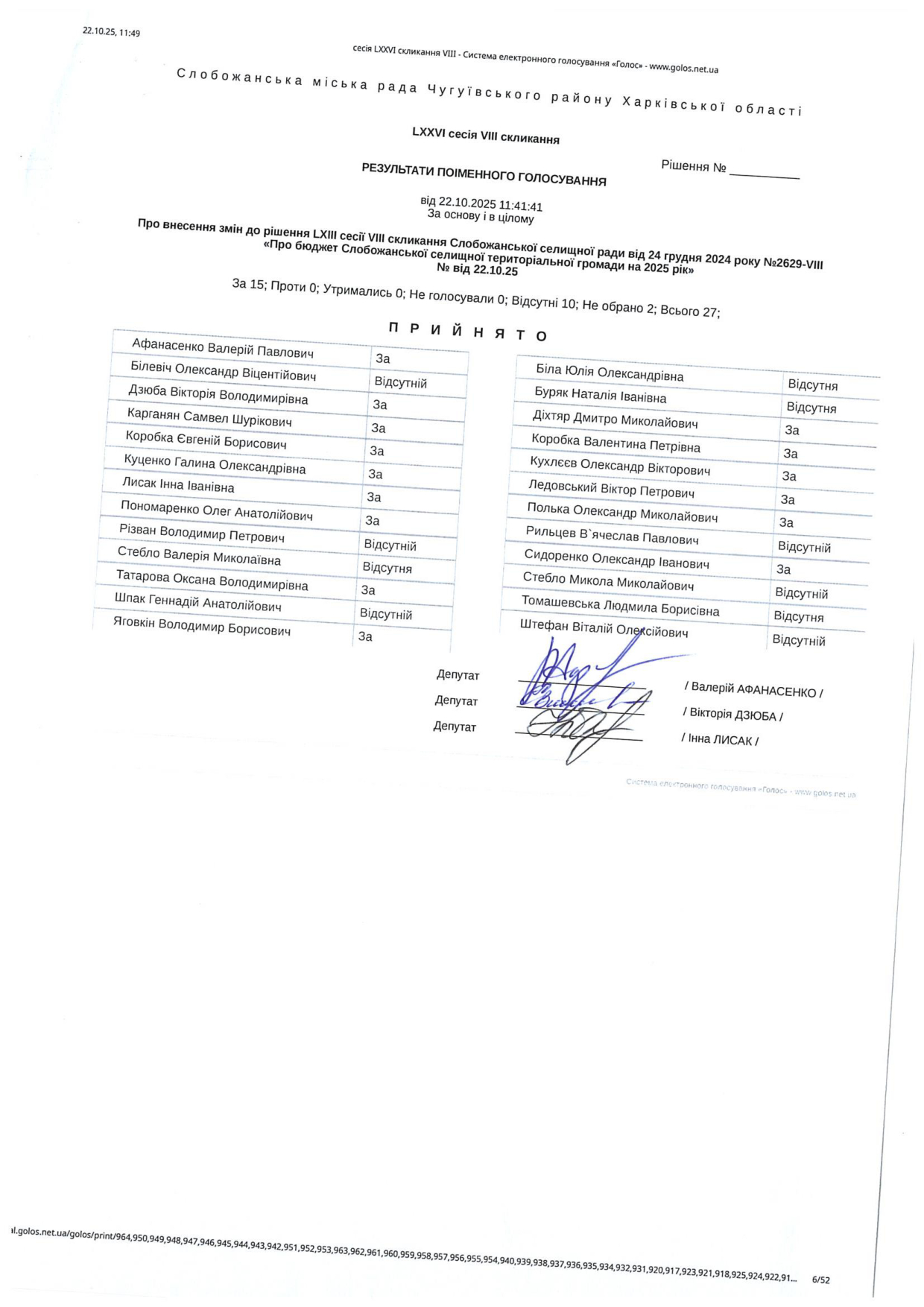 Відомості голосування до рішення сесії №3235 Про внесення змін до рішення LXIII сесії VIII скликання Слобожанської селищної ради від 24 грудня 2024 року №2629-VIII «Про бюджет Слобожанської селищної територіальної громади на 2025 рік».