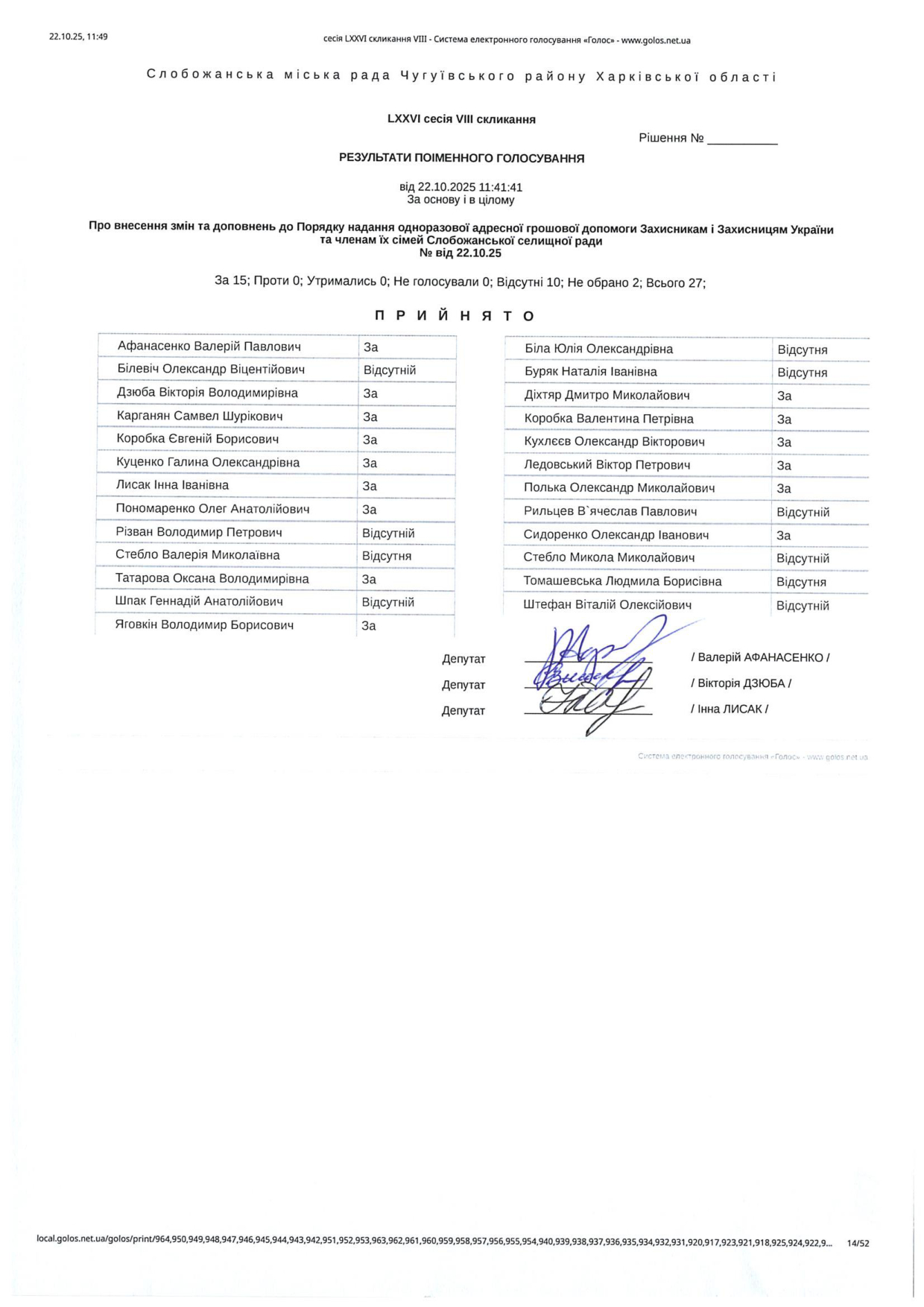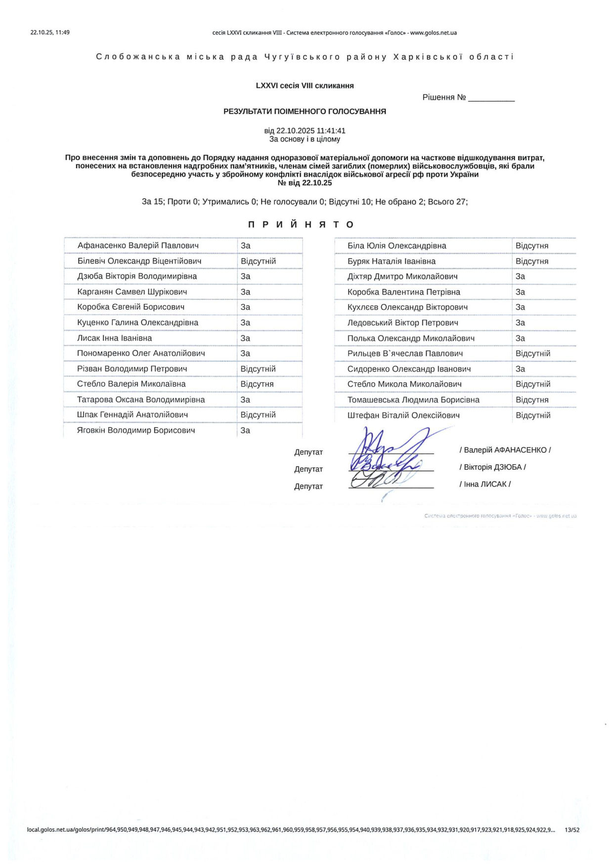 Відомості голосування до рішення сесії №3243 Про внесення змін та доповнень до Порядку надання одноразової адресної грошової допомоги Захисникам і Захисницям України та членам їх сімей Слобожанської селищної ради.
