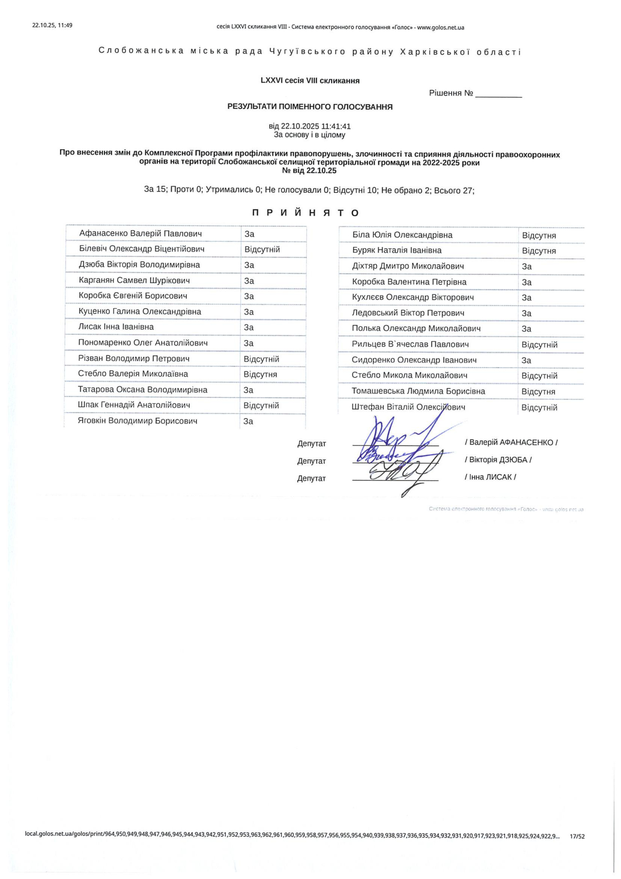 Відомості голосування до рішення сесії №3246 Про внесення змін до Комплексної Програми профілактики правопорушень, злочинності та сприяння діяльності правоохоронних органів на території Слобожанської селищної територіальної громади на 2022-2025 роки