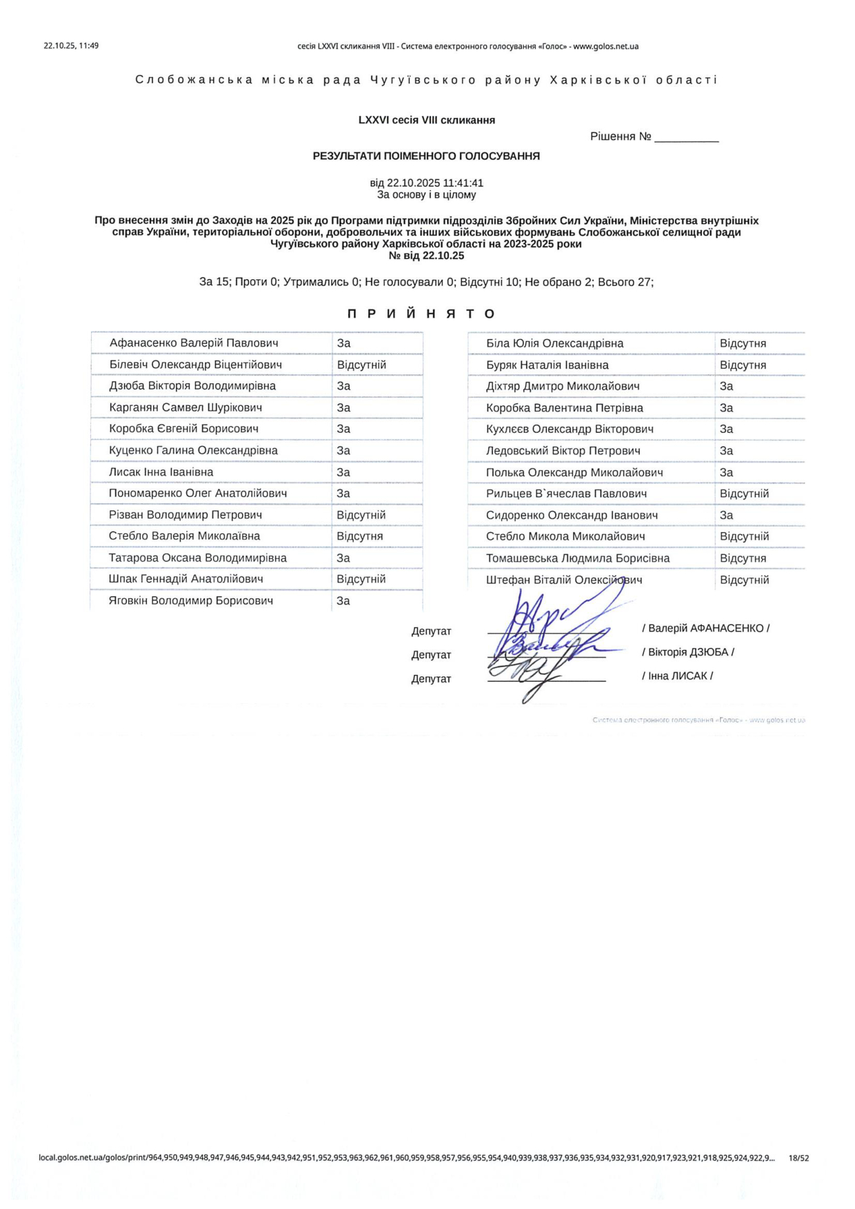 Відомості голосування до рішення сесії №3247 Про внесення змін до Заходів на 2025 рік до Програми підтримки підрозділів Збройних Сил України, Міністерства внутрішніх справ України, територіальної оборони, добровольчих та інших військових формувань Слобожанської селищної ради Чугуївського району Харківської області на 2023-2025 роки.