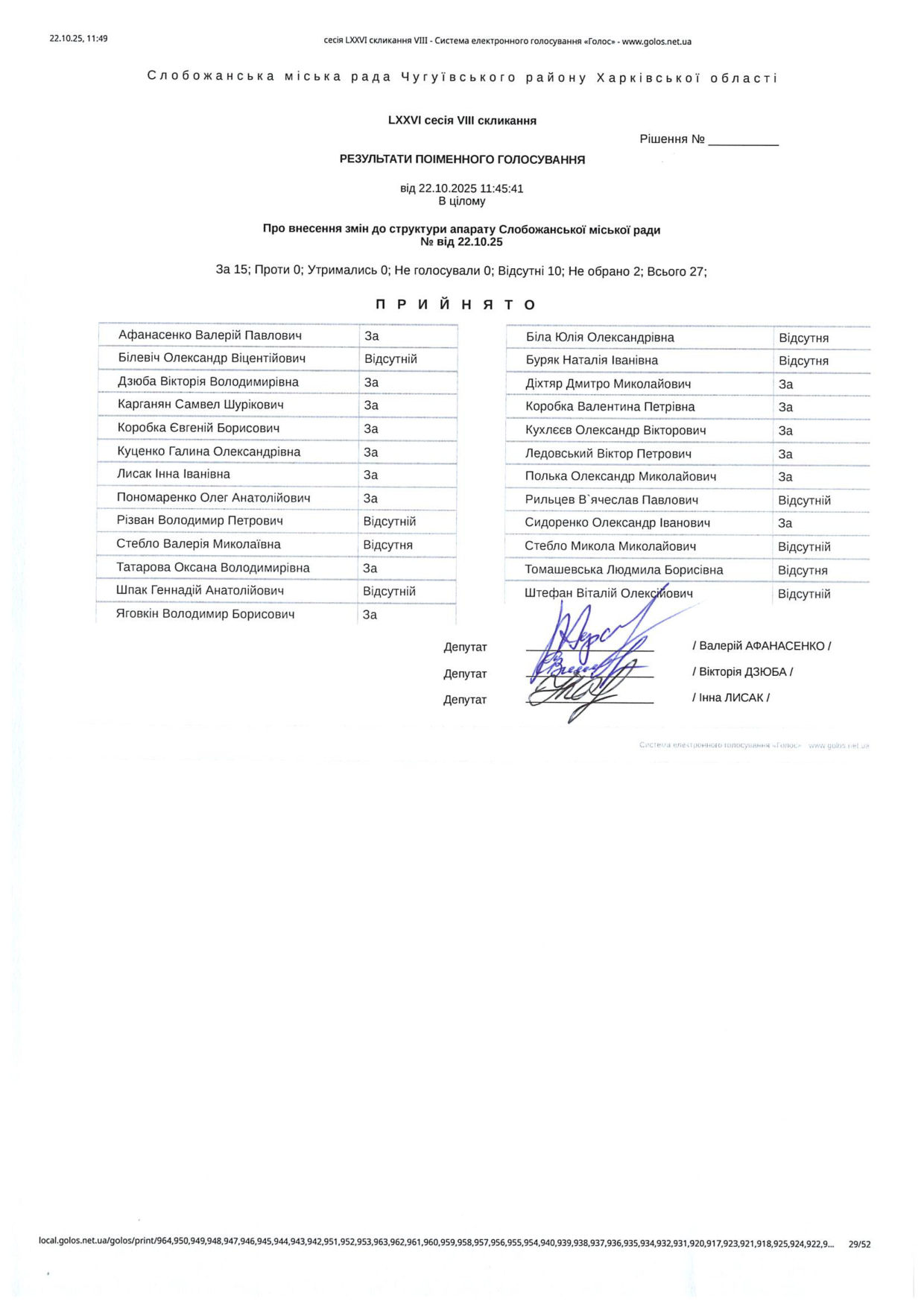 Відомості голосування до рішення сесії №3258 Про внесення змін до структури апарату Слобожанської міської ради.