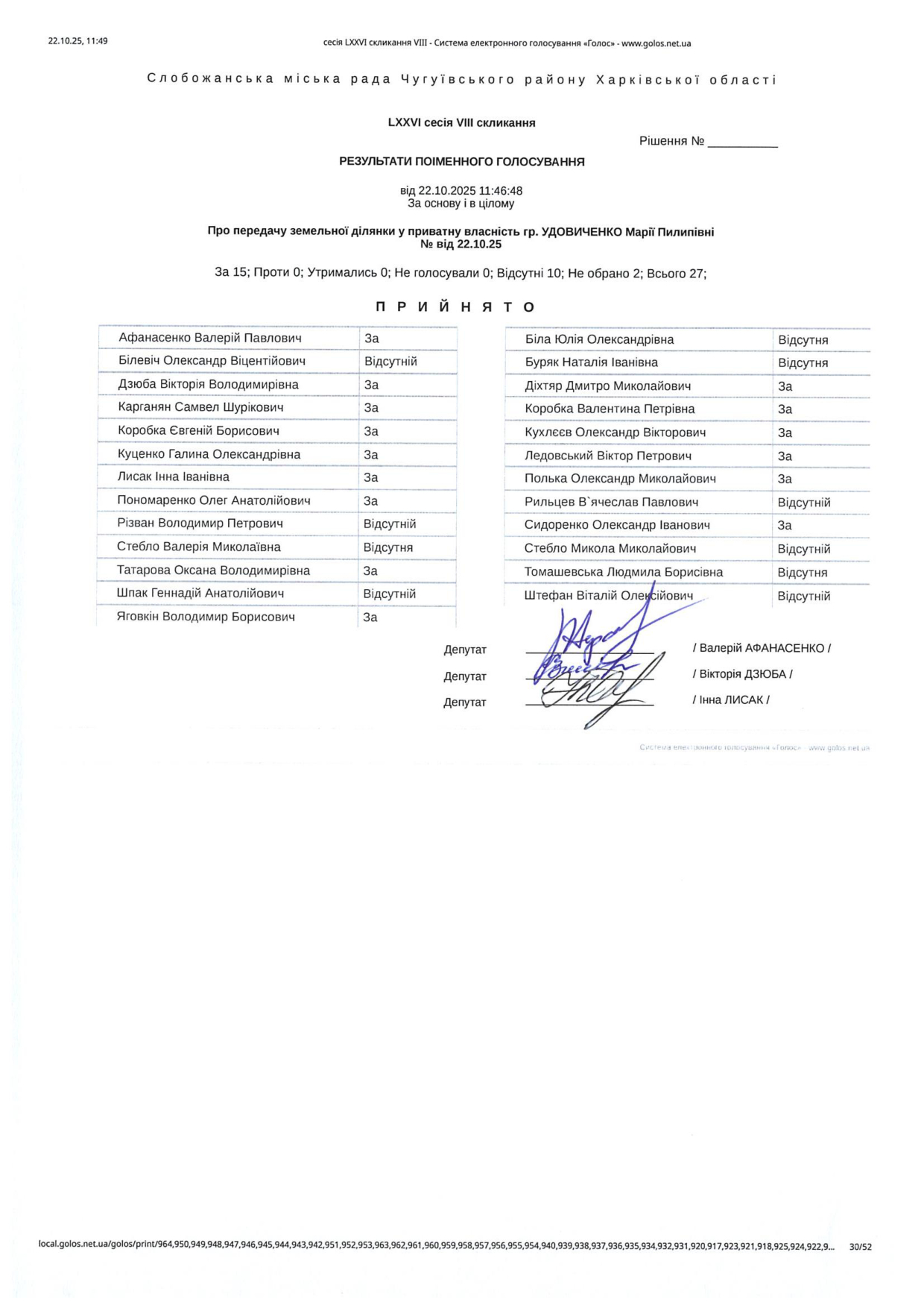 Відомості голосування до рішення сесії №3259 Про передачу земельної ділянки у приватну власність гр. УДОВИЧЕНКО Марії Пилипівні.