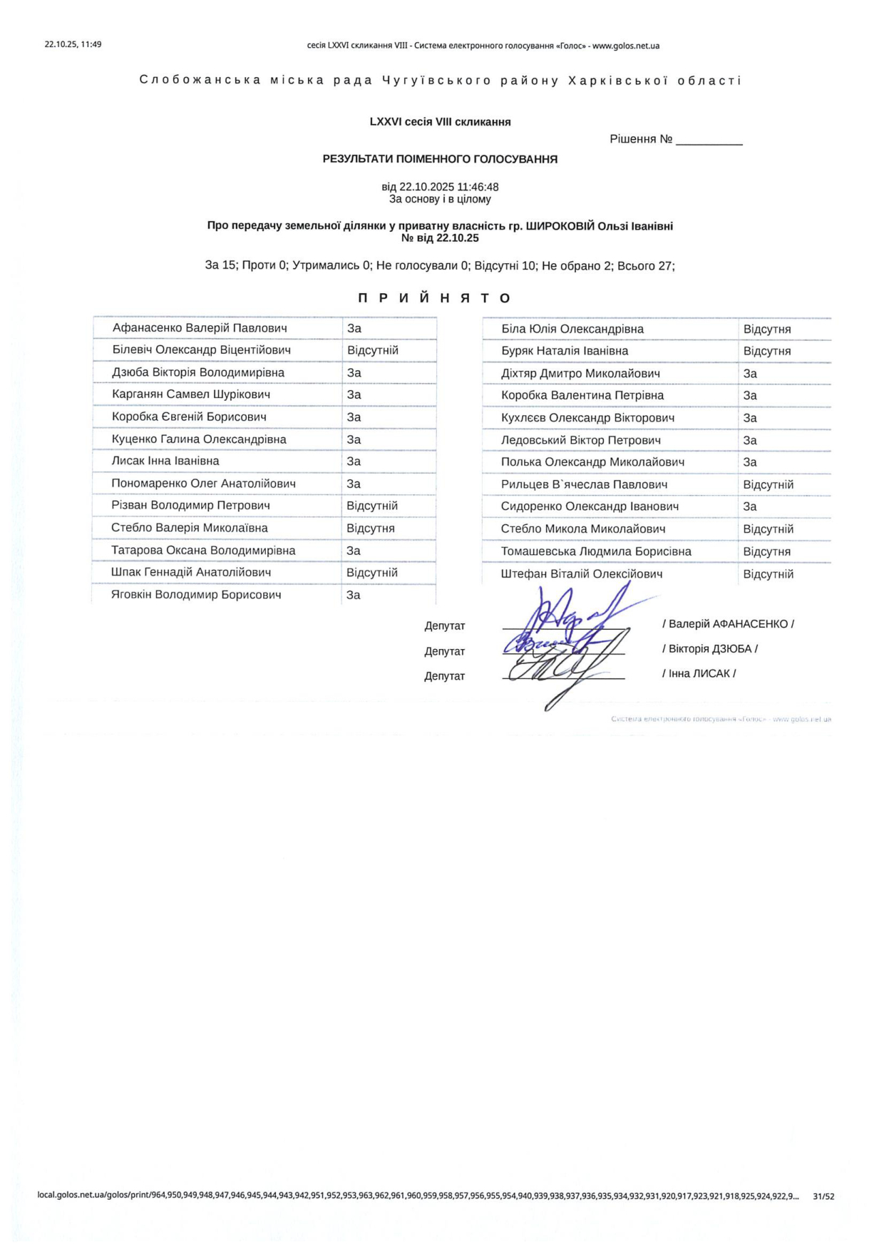 Відомості голосування до рішення сесії №3260 Про передачу земельної ділянки у приватну власність гр. ШИРОКОВІЙ Ользі Іванівні.