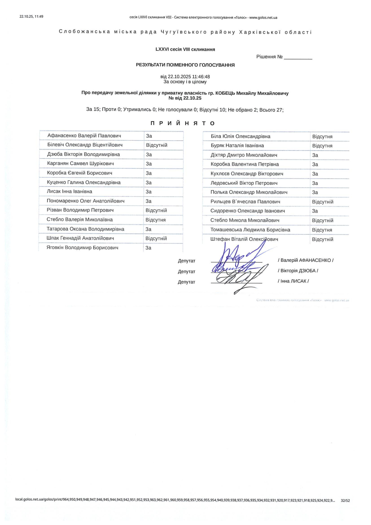 Відомості голосування до рішення сесії №3261 Про передачу земельної ділянки у приватну власність гр. КОБЕЦЬ Михайлу Михайловичу.