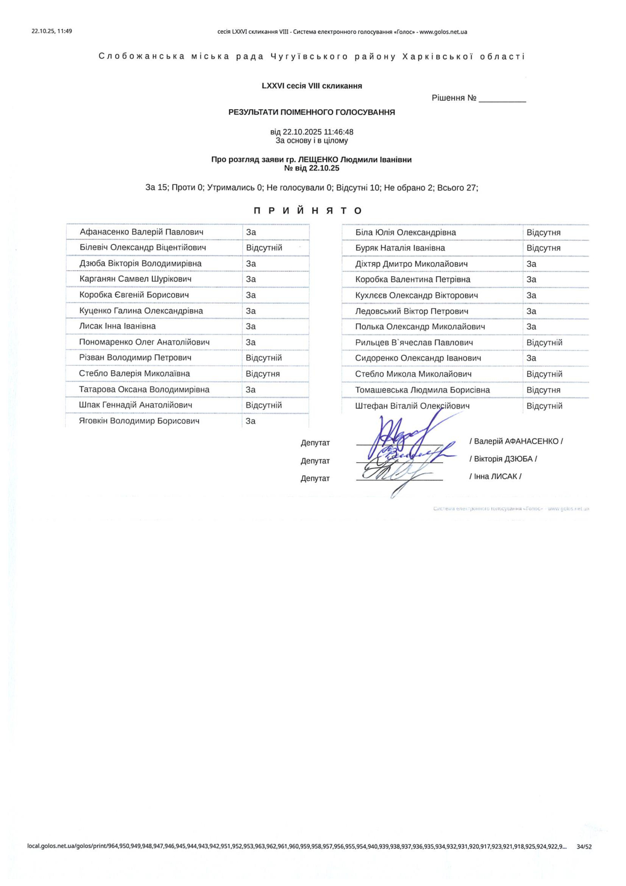 Відомості голосування до рішення сесії №3263 Про розгляд заяви гр. ЛЕЩЕНКО Людмили Іванівни.