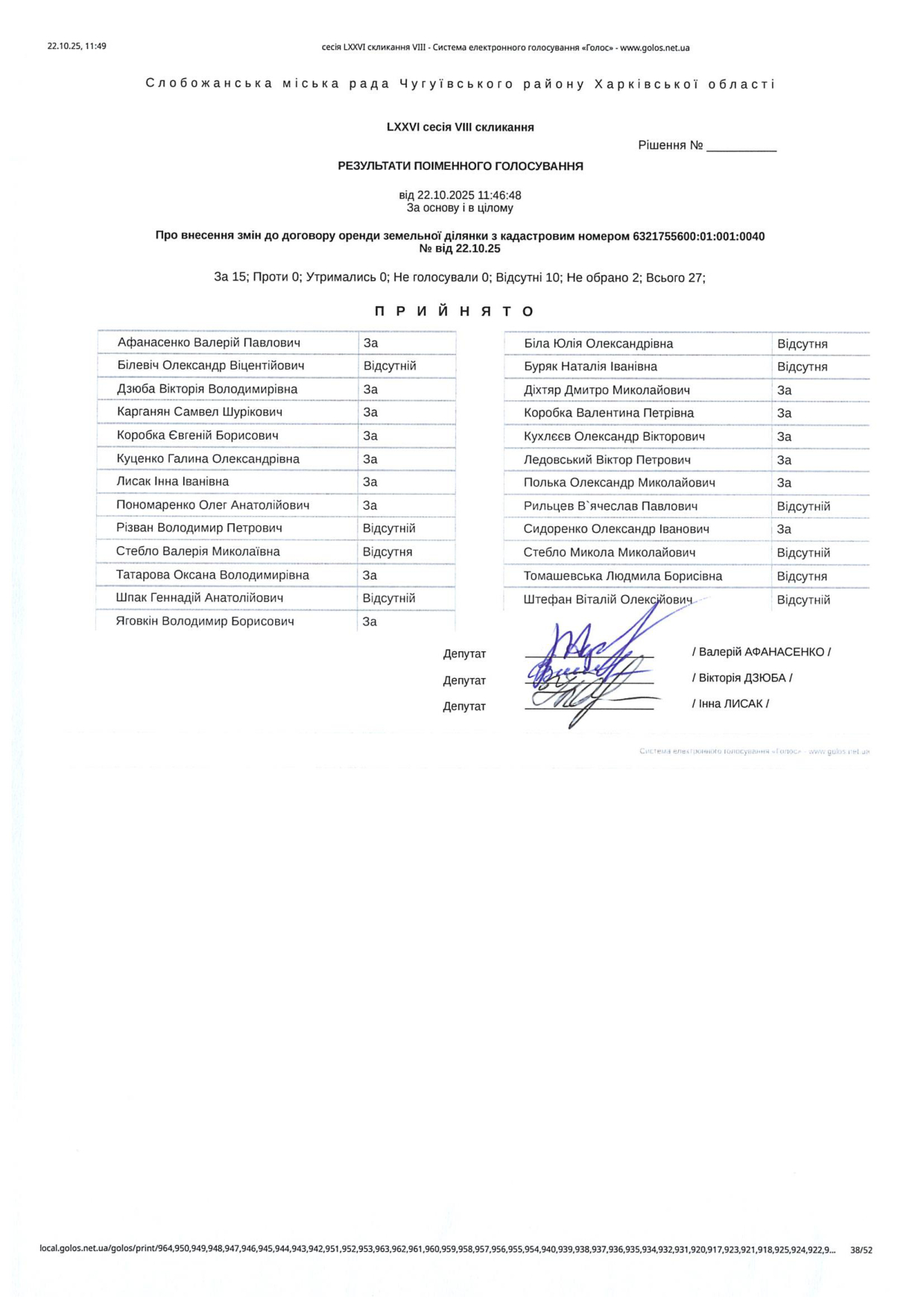 Відомості голосування до рішення сесії №3267 Про внесення змін до договору оренди земельної ділянки з кадастровим номером 6321755600:01:001:0040.