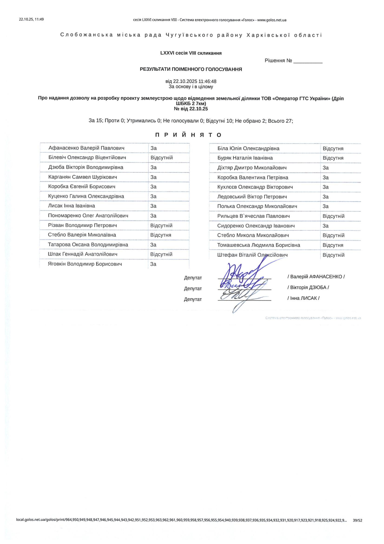 Відомості голосування до рішення сесії №3270 Про надання дозволу на розробку проекту землеустрою щодо відведення земельної ділянки ТОВ «Оператор ГТС України» (Стовп опізнавальний 7,2 км).