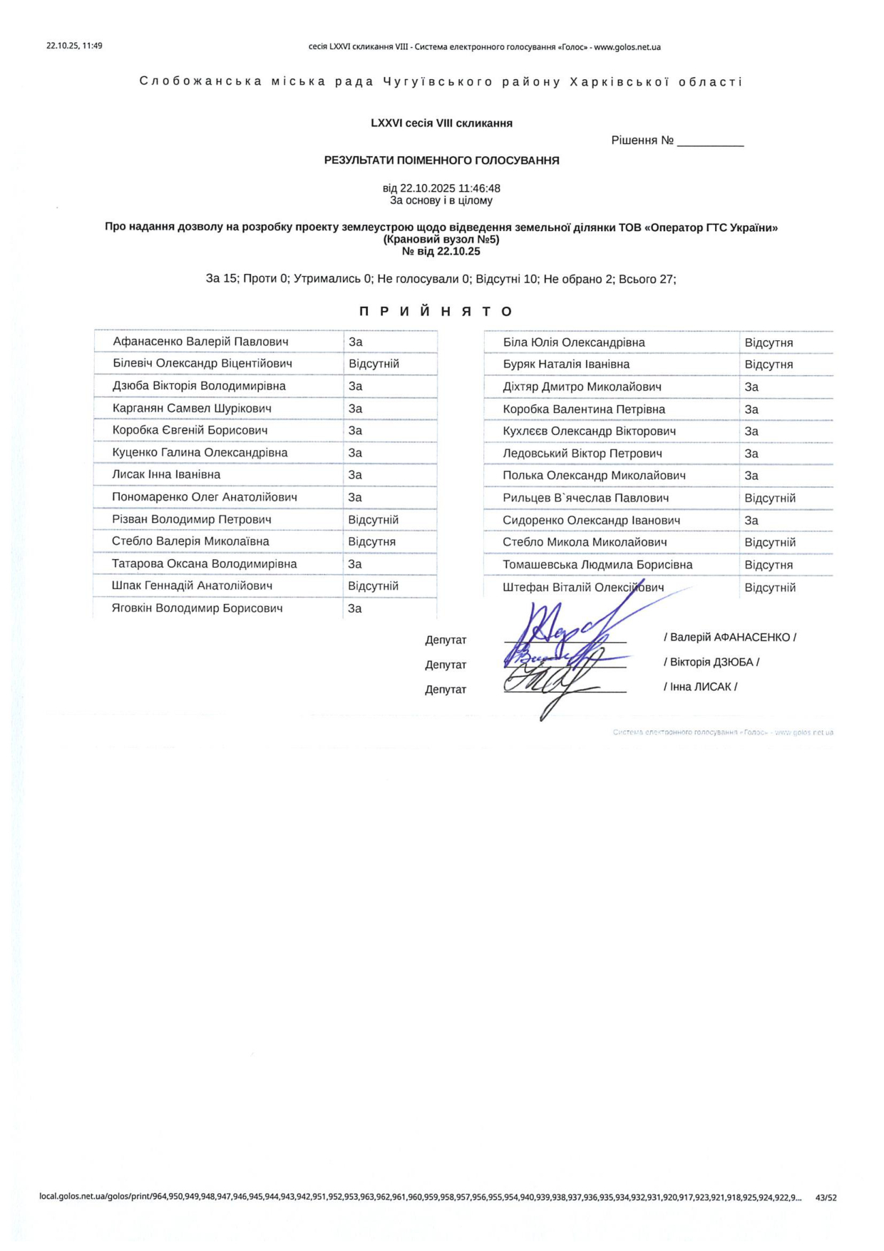 Відомості голосування до рішення сесії №3272 Про надання дозволу на розробку проекту землеустрою щодо відведення земельної ділянки ТОВ «Оператор ГТС України» (Крановий вузол №5).