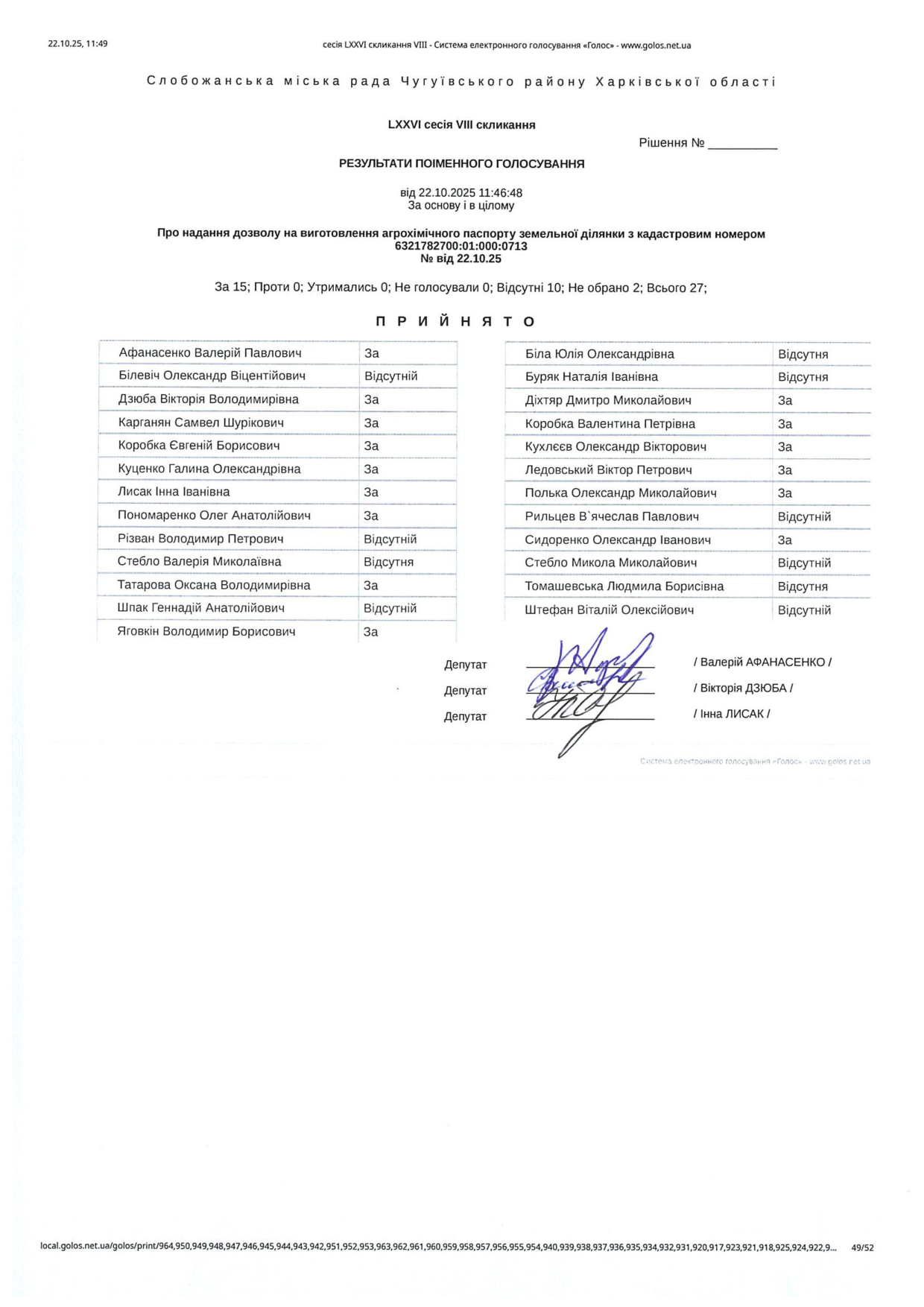 Відомості голосування до рішення сесії №3279 Про надання дозволу на виготовлення агрохімічного паспорту земельної ділянки з кадастровим номером 6321782700:01:000:0714.