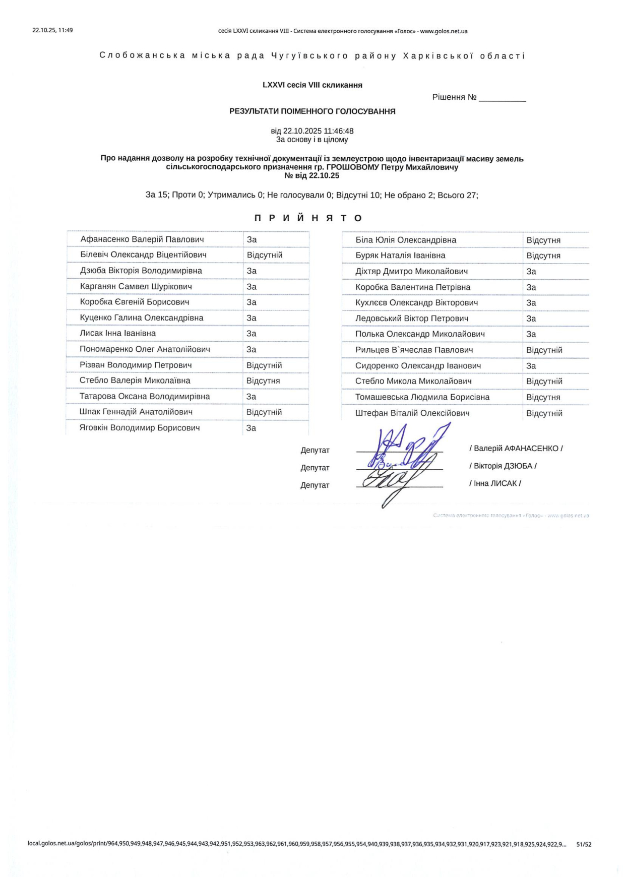 Відомості голосування до рішення сесії №3280 Про надання дозволу на розробку технічної документації із землеустрою щодо інвентаризації масиву земель сільськогосподарського призначення гр. ГРОШОВОМУ Петру Михайловичу.