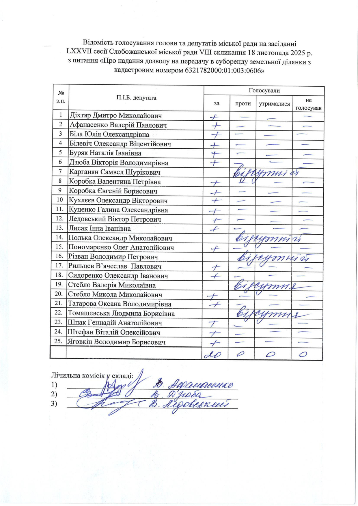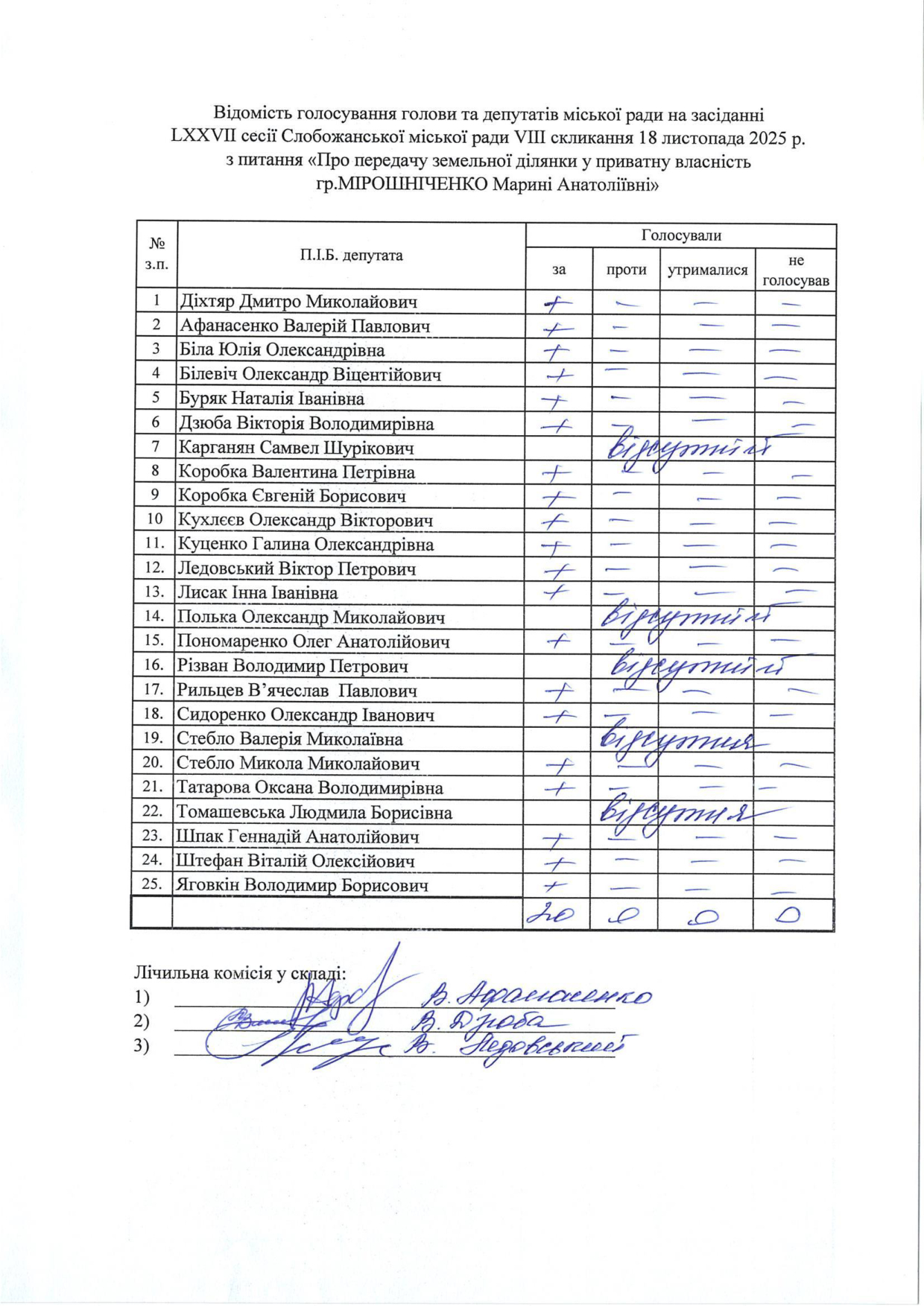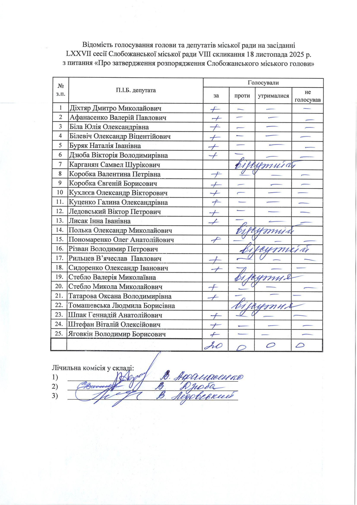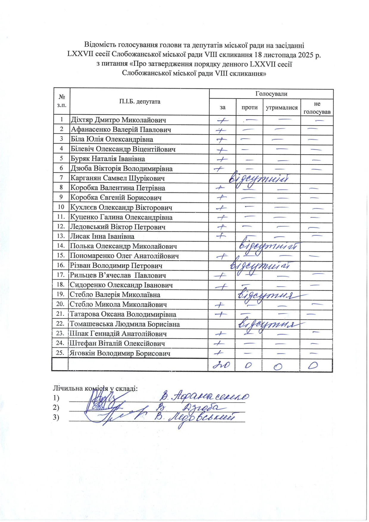 Відомості голосування до рішення сесії №3282 Про затвердження порядку денного LXXVІІ сесії Слобожанської міської ради VІІІ скликання