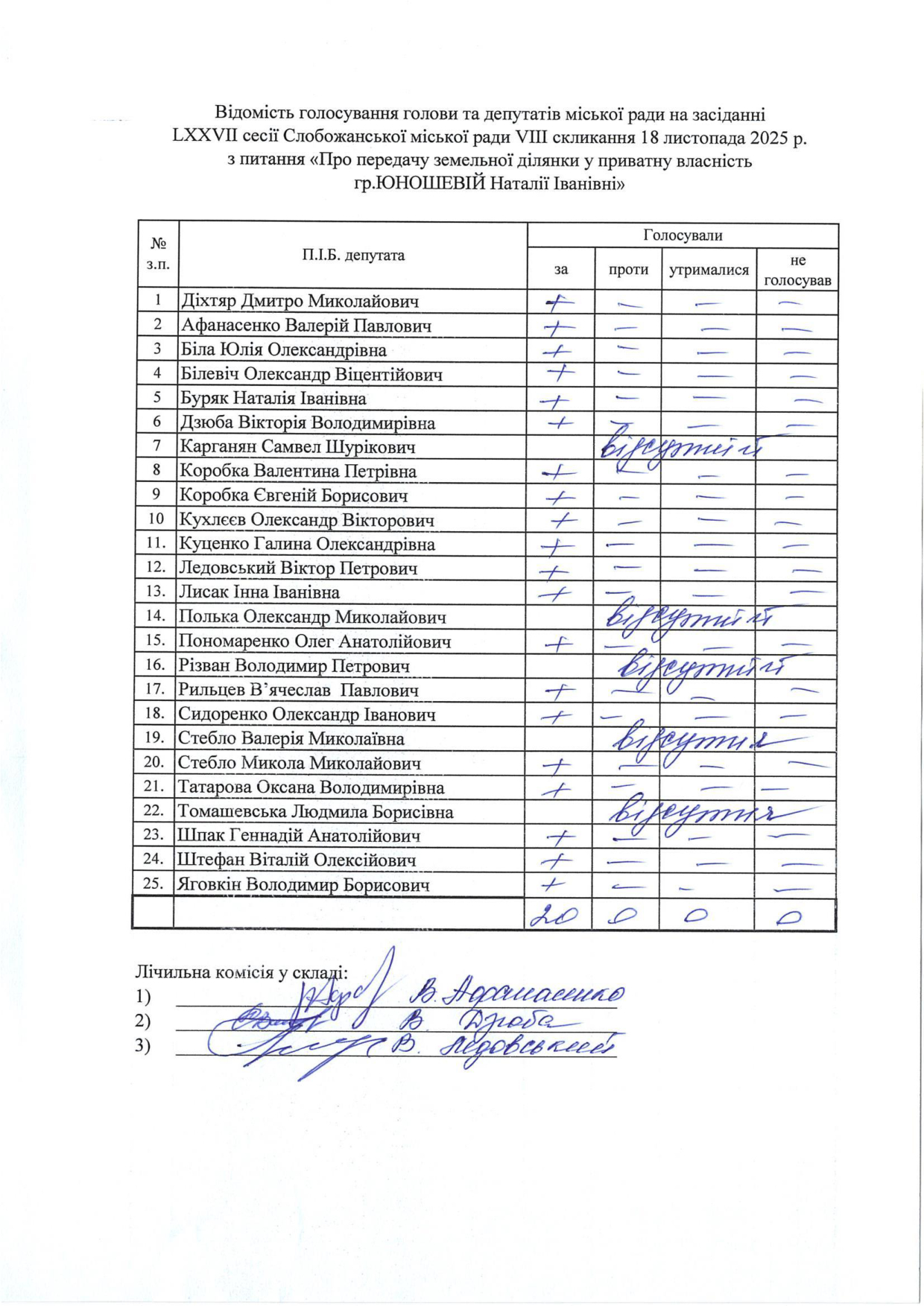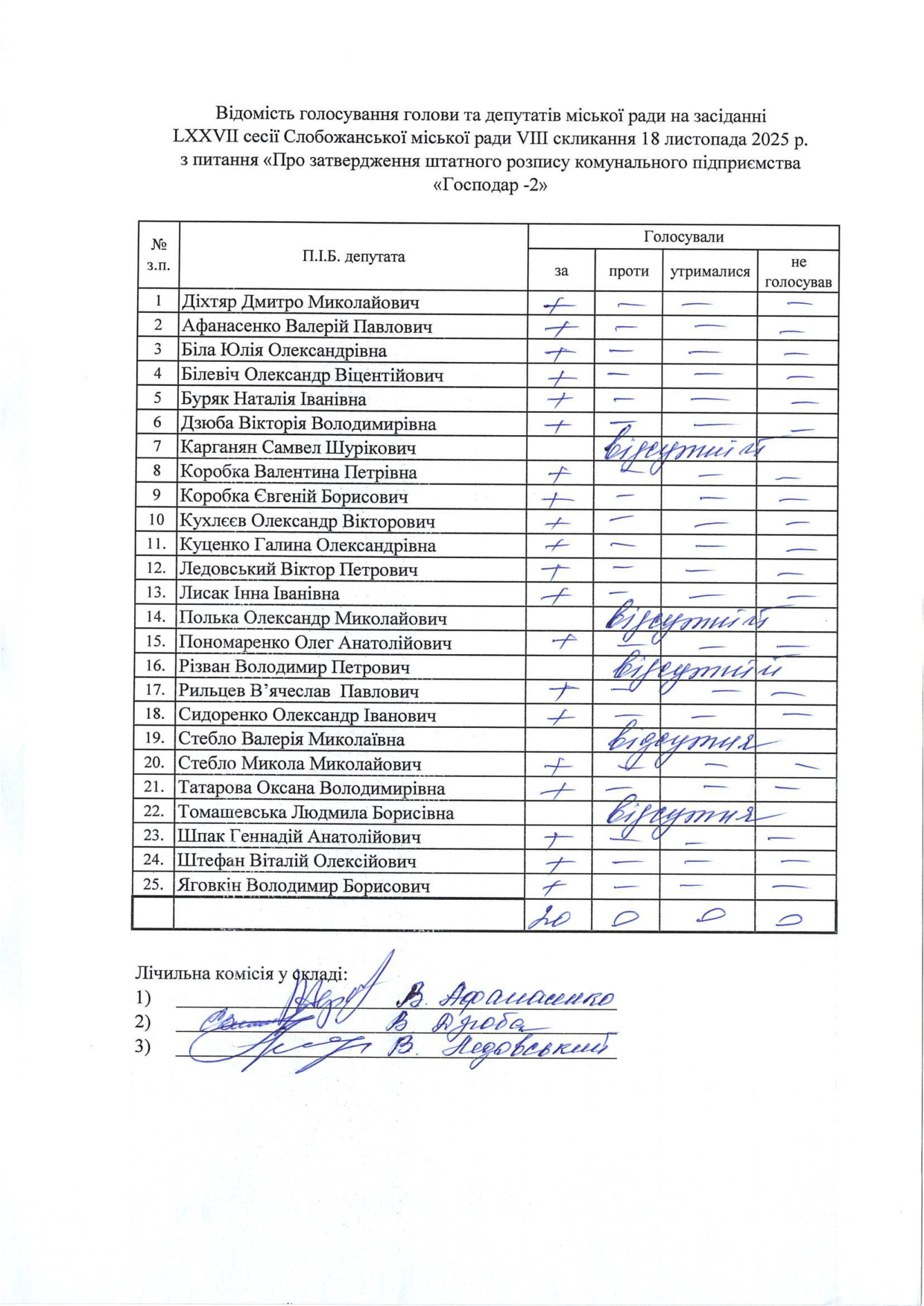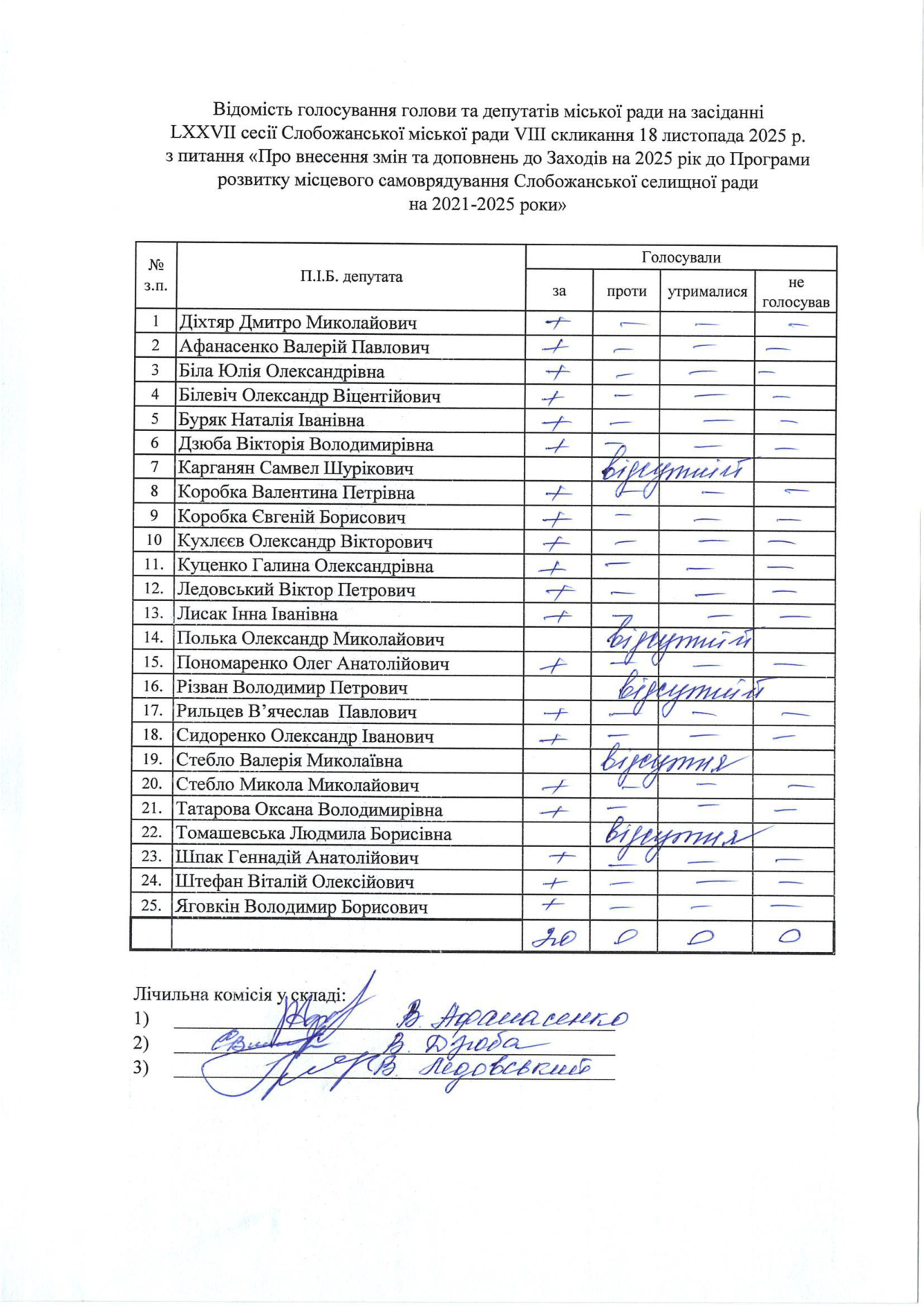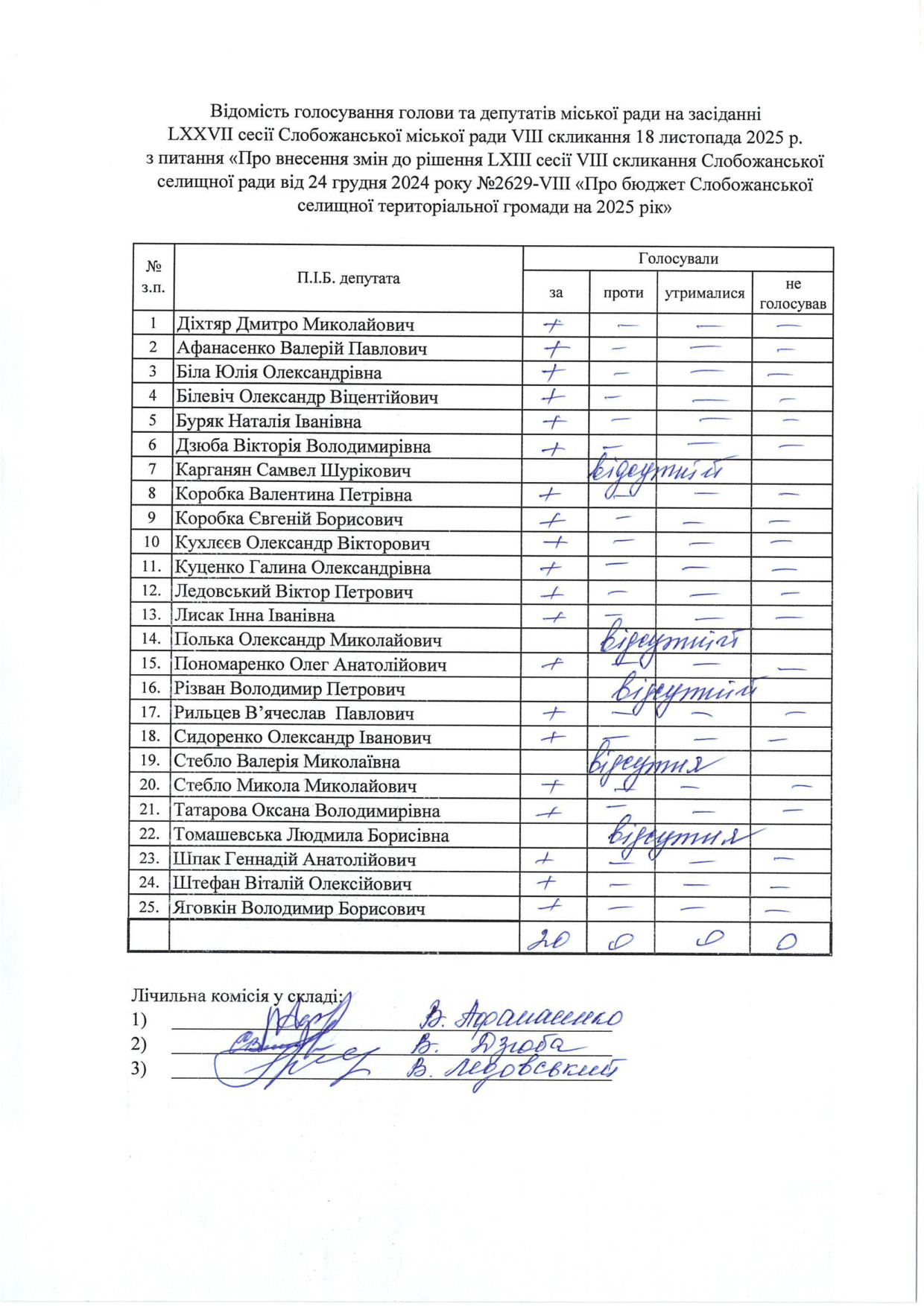 Відомості голосування до рішення сесії №3283 Про внесення змін до рішення LXIII сесії VIII скликання Слобожанської селищної ради від 24 грудня 2024 року №2629-VIII «Про бюджет Слобожанської селищної територіальної громади на 2025 рік»