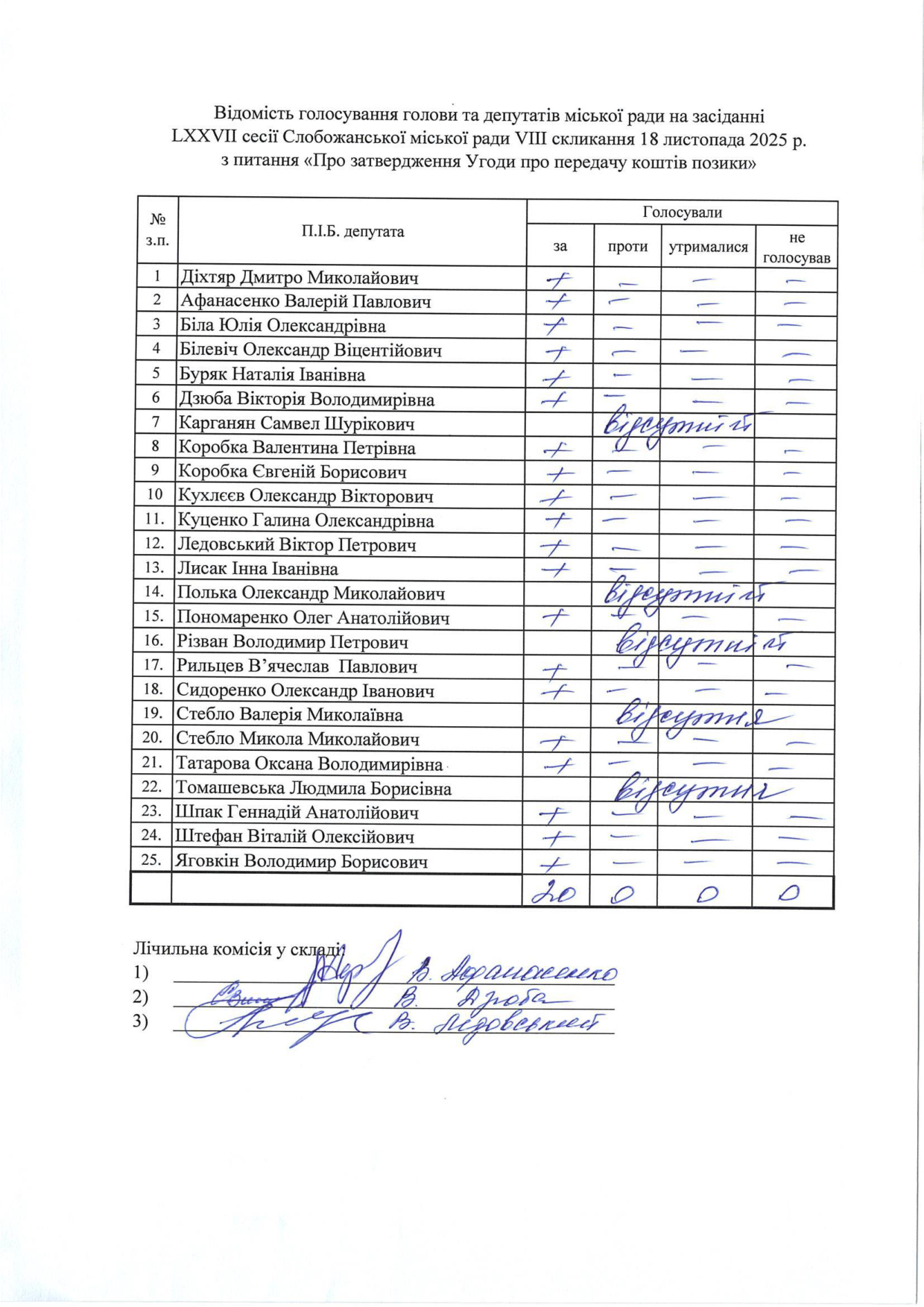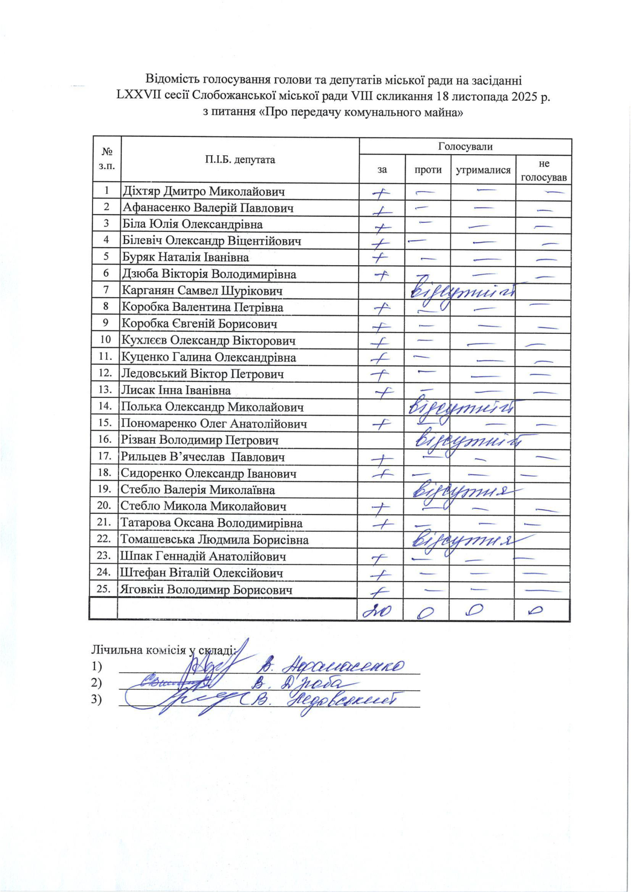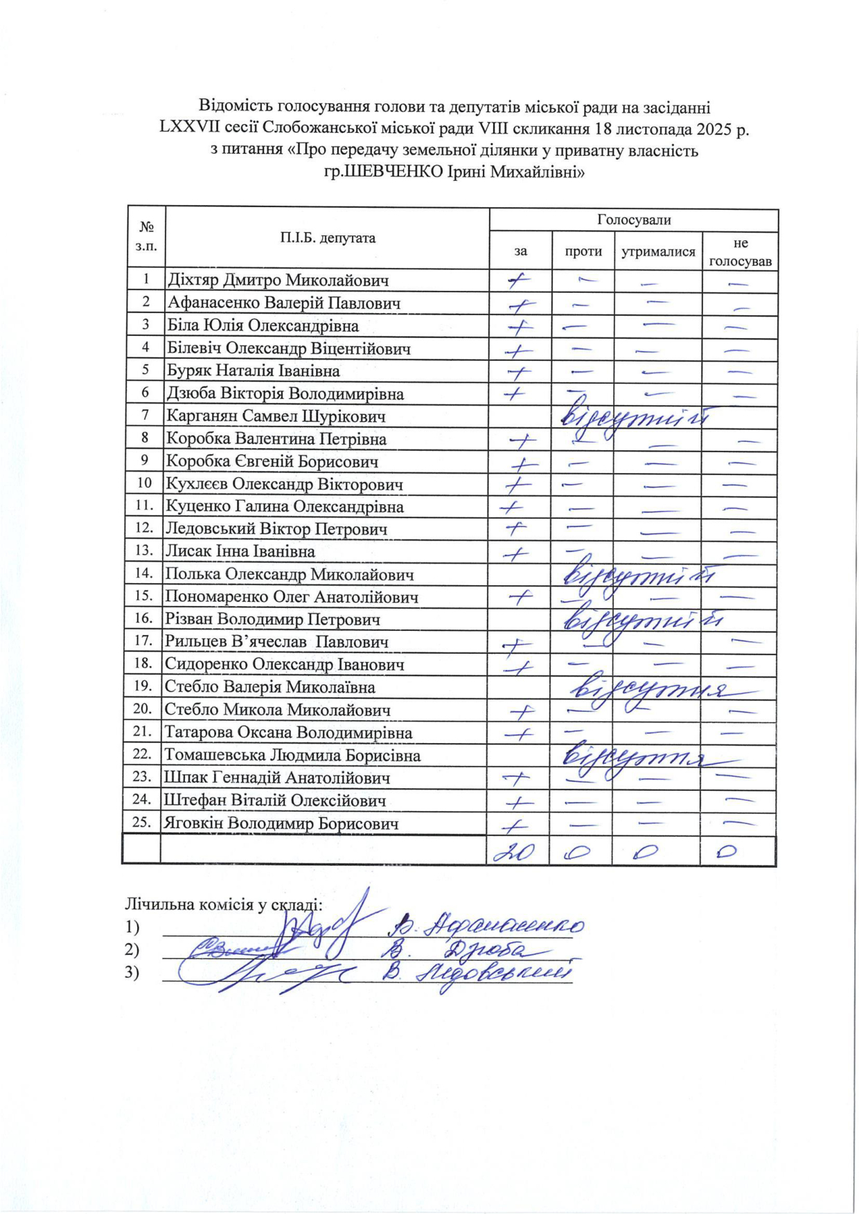 Відомості голосування до рішення сесії №3283 Про внесення змін до рішення LXIII сесії VIII скликання Слобожанської селищної ради від 24 грудня 2024 року №2629-VIII «Про бюджет Слобожанської селищної територіальної громади на 2025 рік»