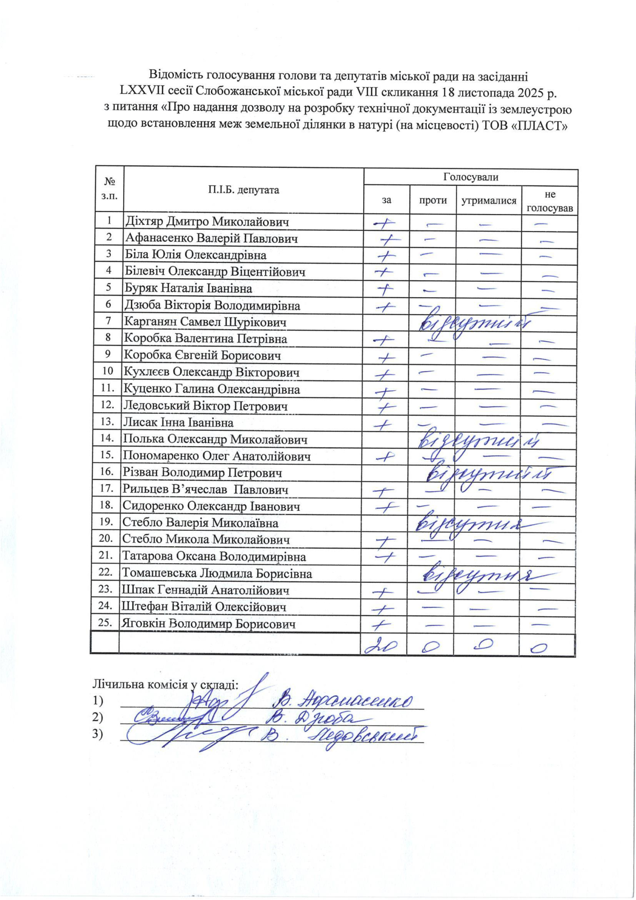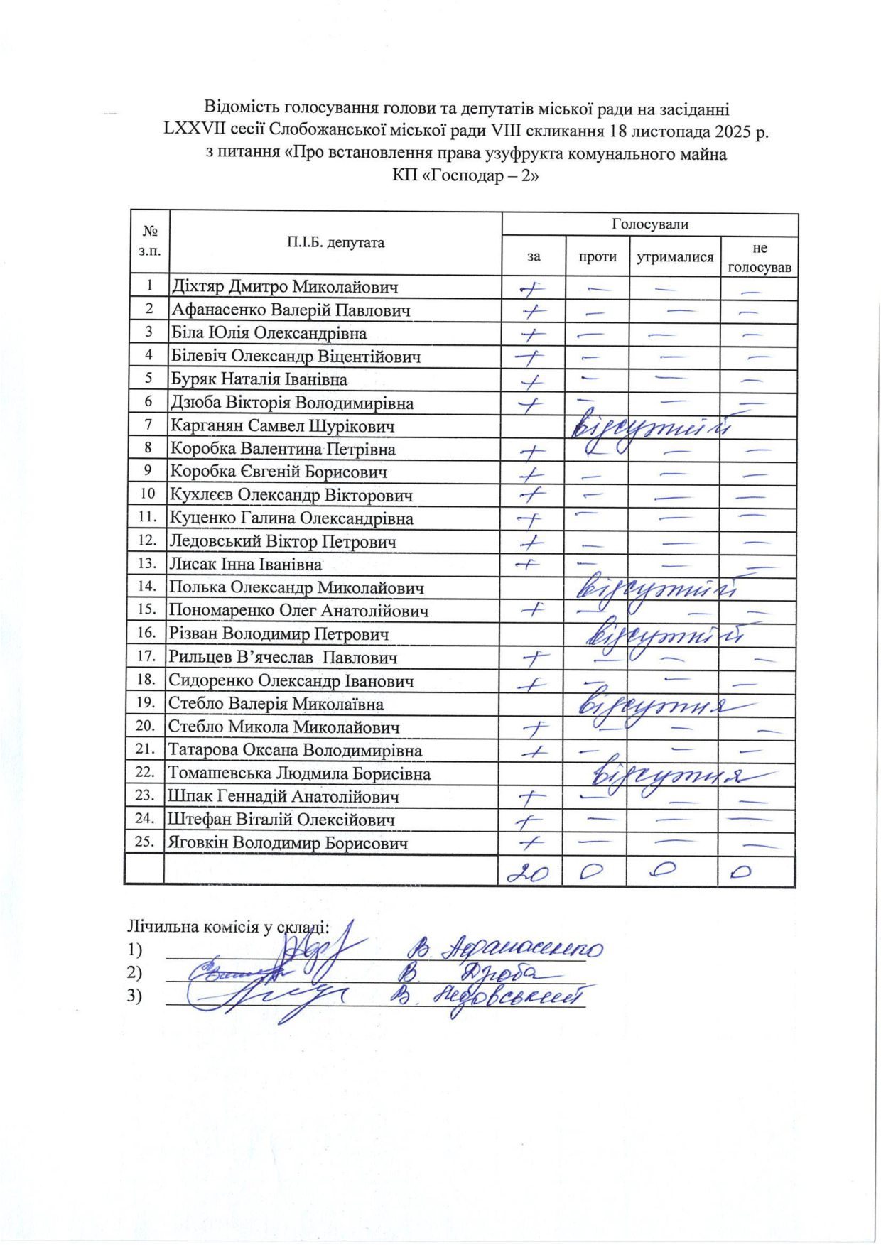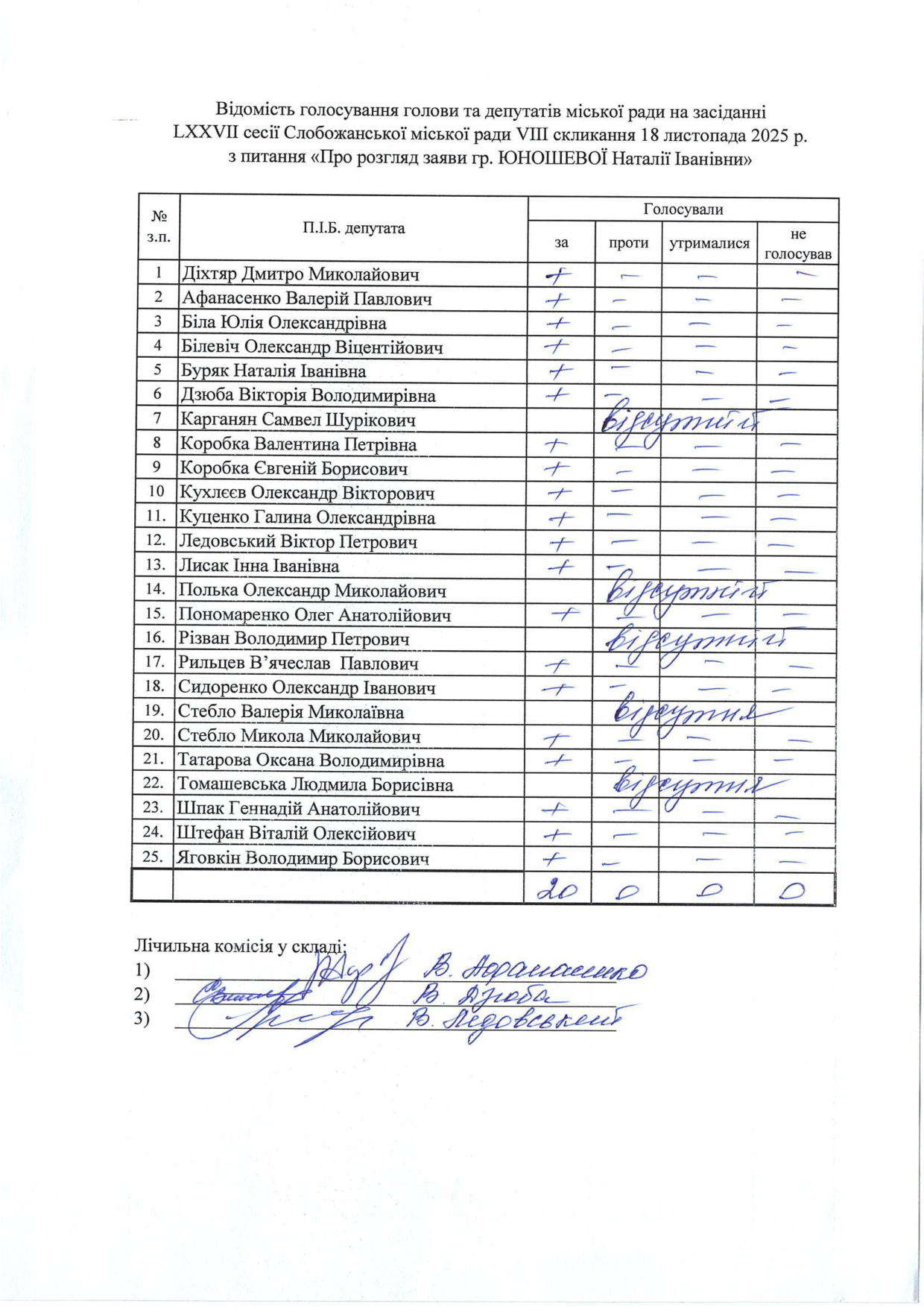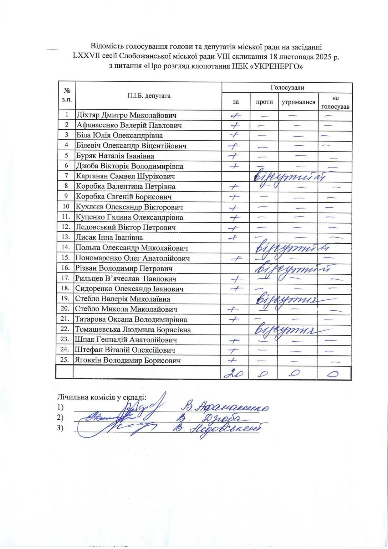 Відомості голосування до рішення сесії №3283 Про внесення змін до рішення LXIII сесії VIII скликання Слобожанської селищної ради від 24 грудня 2024 року №2629-VIII «Про бюджет Слобожанської селищної територіальної громади на 2025 рік»