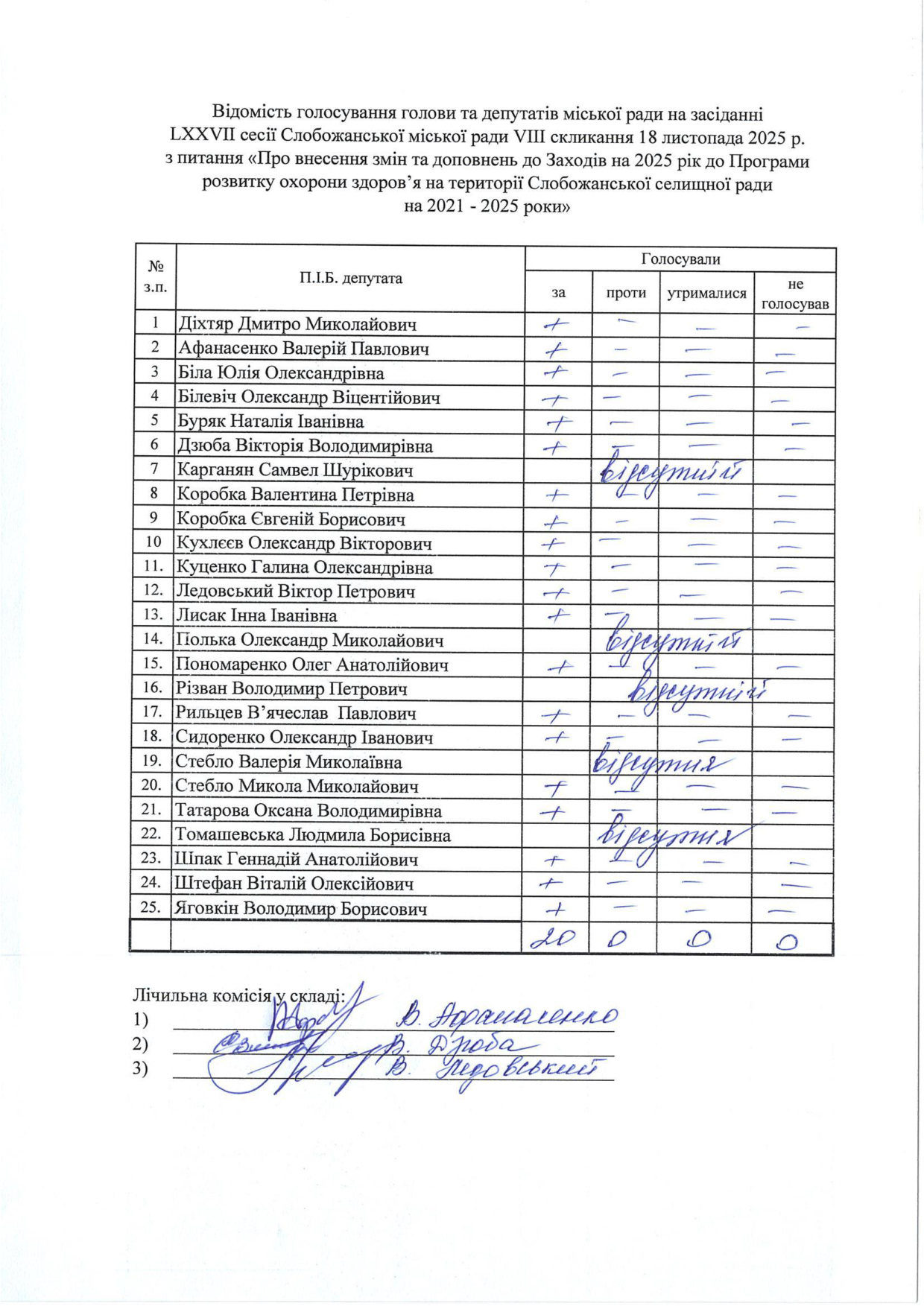 Відомості голосування до рішення сесії №3284 Про внесення змін та доповнень до Заходів на 2025 рік до Програми розвитку охорони здоров’я на території Слобожанської селищної ради на 2021 - 2025 роки