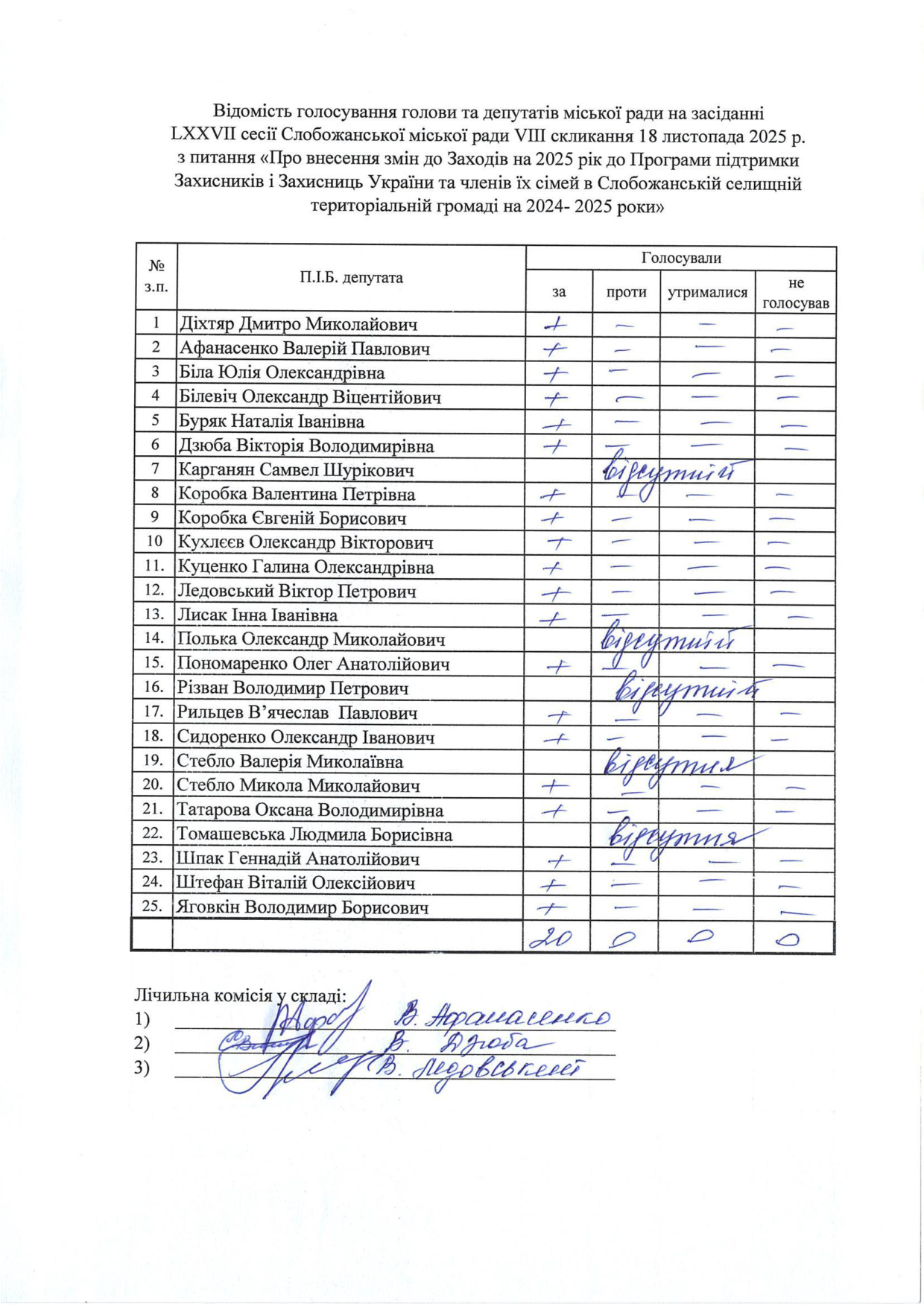 Відомості голосування до рішення сесії №3285 Про внесення змін до Заходів на 2025 рік до Програми підтримки Захисників і Захисниць України та членів їх сімей в Слобожанській селищній територіальній громаді на 2024- 2025 роки