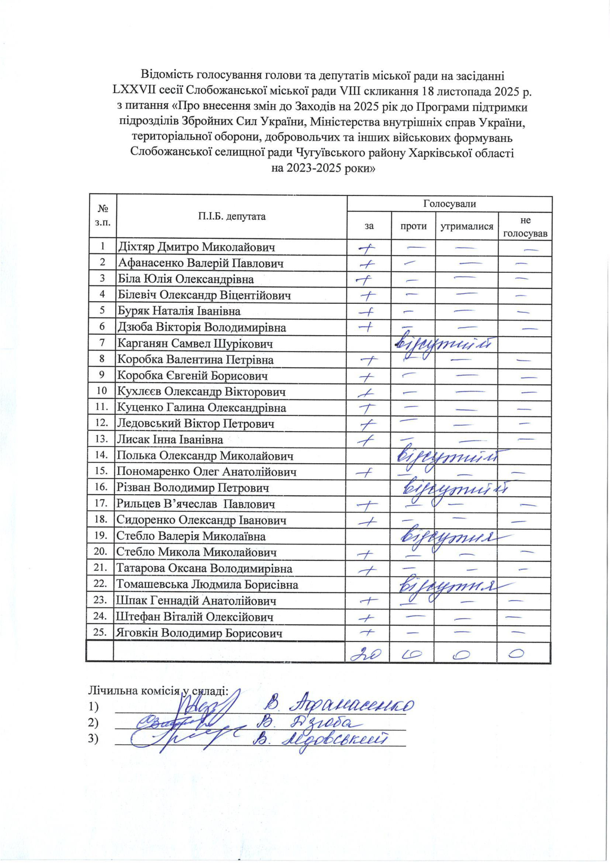 Відомості голосування до рішення сесії №3288 Про внесення змін до Заходів на 2025 рік до Програми підтримки підрозділів Збройних Сил України, Міністерства внутрішніх справ України, територіальної оборони, добровольчих та інших військових формувань Слобожанської селищної ради Чугуївського району Харківської області на 2023-2025 роки