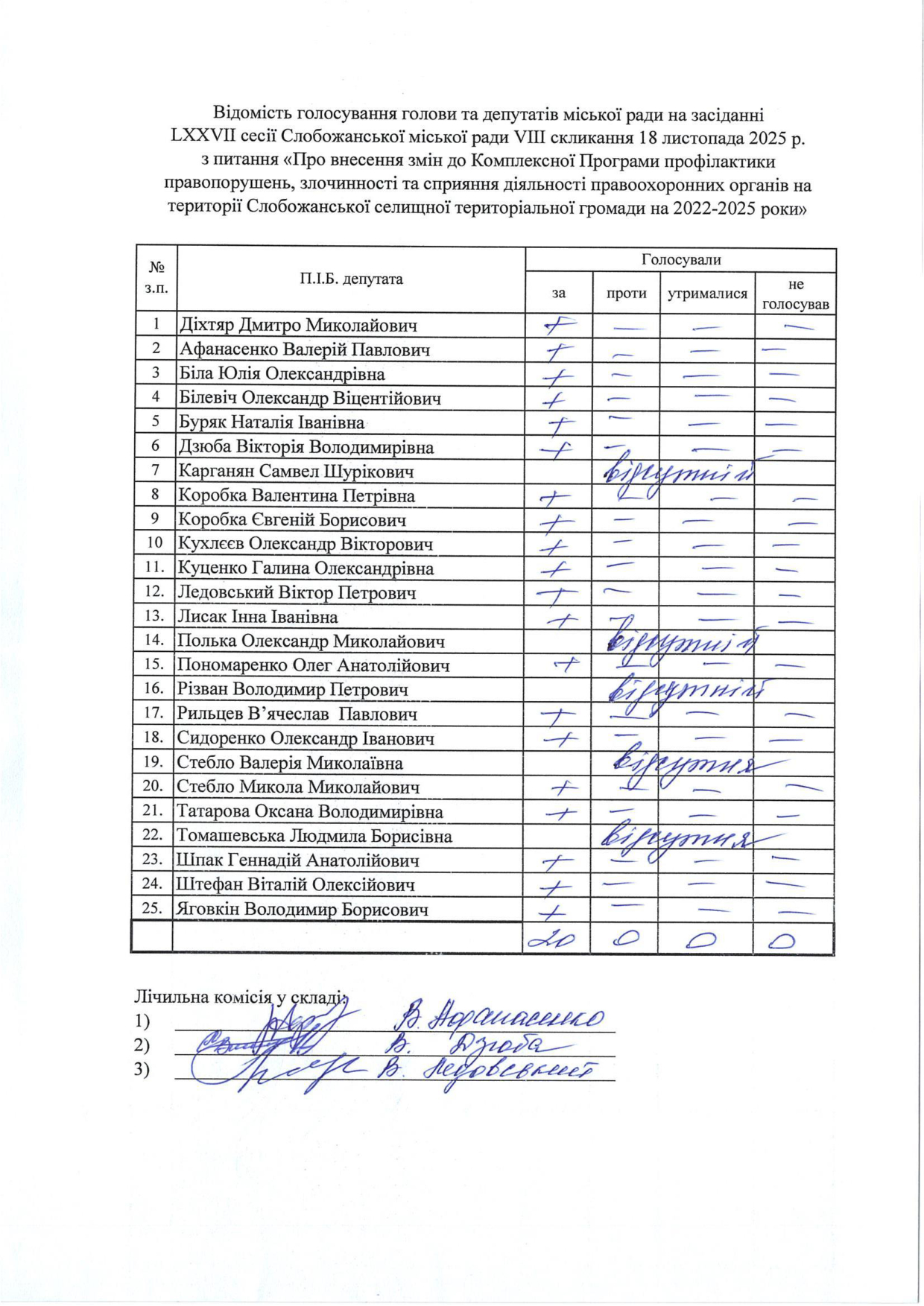 Відомості голосування до рішення сесії №3289 Про внесення змін до Комплексної Програми профілактики правопорушень, злочинності та сприяння діяльності правоохоронних органів на території Слобожанської селищної територіальної громади на 2022-2025 роки