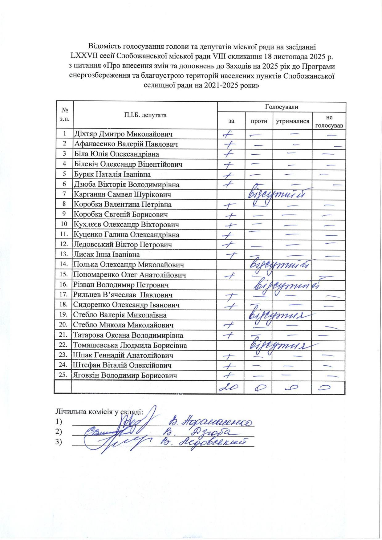 Відомості голосування до рішення сесії №3292 Про внесення змін в Заходи на 2025 рік до Програми соціально – економічного розвитку Слобожанської селищної територіальної громади на 2024 – 2027 роки
