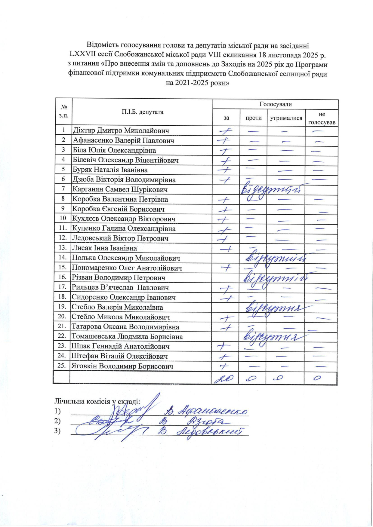 Відомості голосування до рішення сесії №3291 Про внесення змін та доповнень до Заходів на 2025 рік до Програми фінансової підтримки комунальних підприємств Слобожанської селищної ради на 2021-2025 роки
