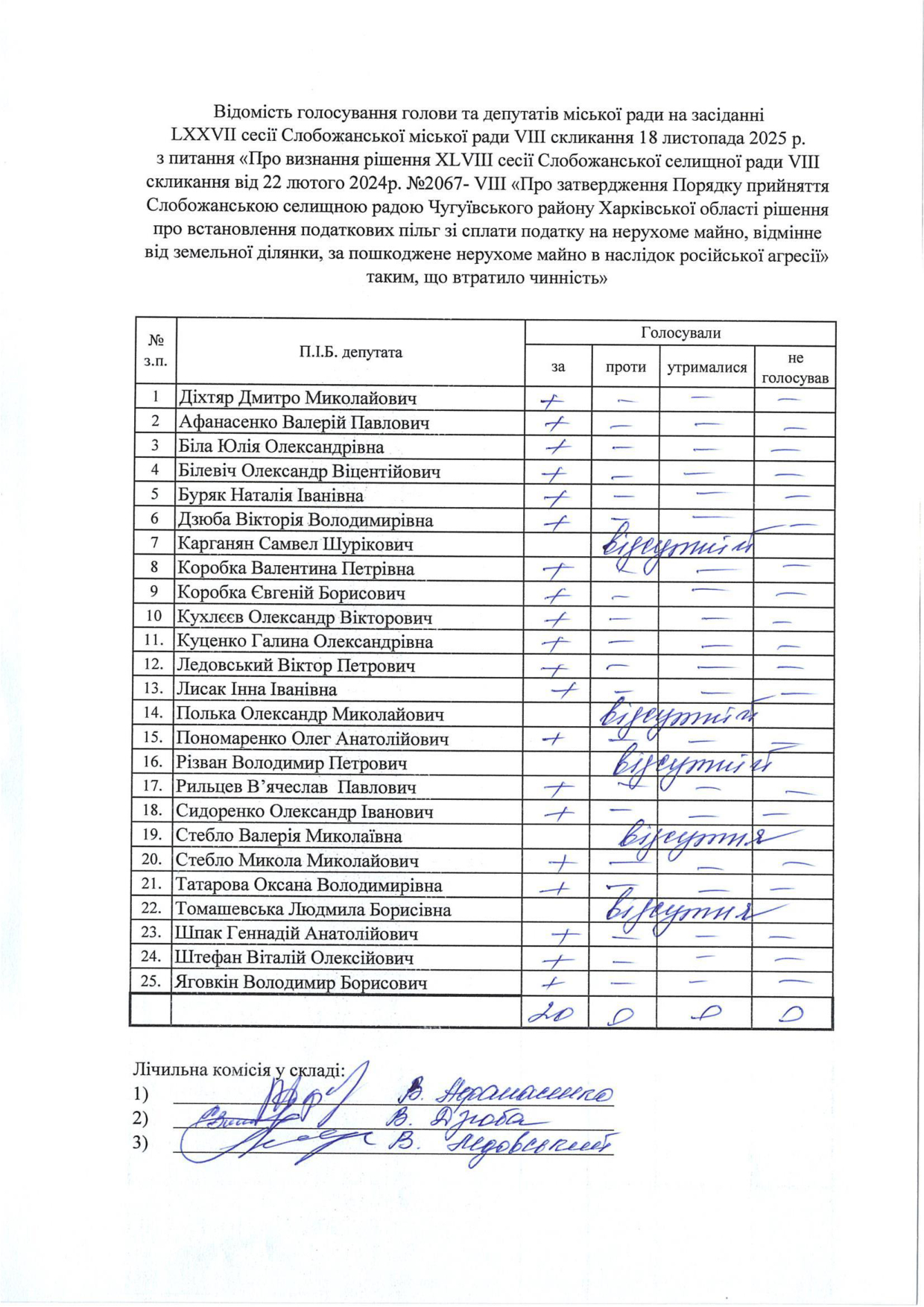 Відомості голосування до рішення сесії №3294 Про визнання рішення XLVIII сесії Слобожанської селищної ради VIII скликання від 22 лютого 2024р. №2067- VIII «Про затвердження Порядку прийняття Слобожанською селищною радою Чугуївського району Харківської області рішення про встановлення податкових пільг зі сплати податку на нерухоме майно, відмінне від земельної ділянки, за пошкоджене нерухоме майно в наслідок російської агресії» таким, що втратило чинність