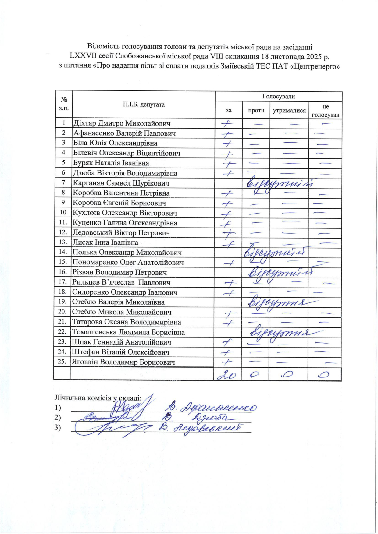 Відомості голосування до рішення сесії №3295 Про надання пільг зі сплати податків Зміївській ТЕС ПАТ «Центренерго»
