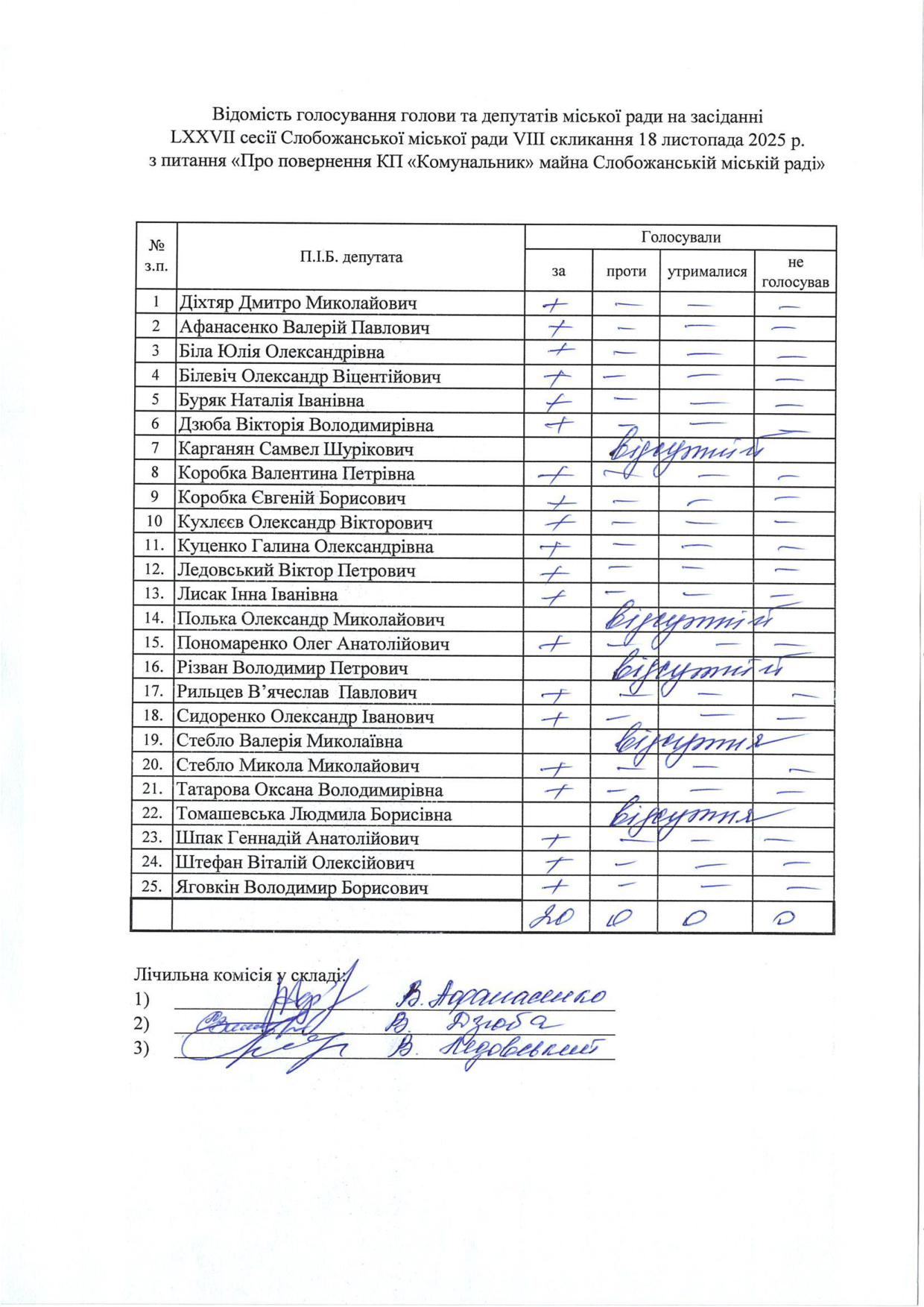 Відомості голосування до рішення сесії №3296 Про повернення КП «Комунальник» майна Слобожанській міській раді