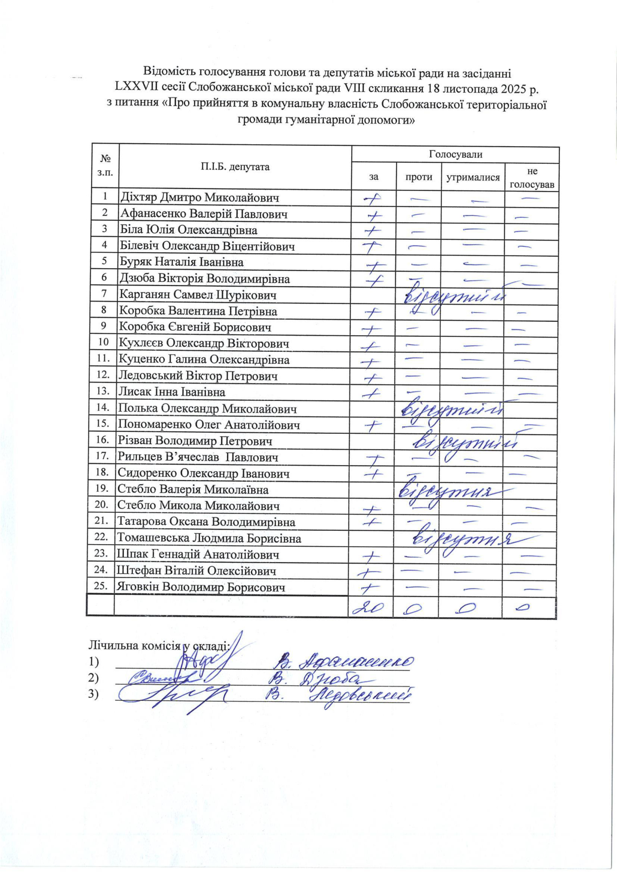 Відомості голосування до рішення сесії №3299 Про прийняття в комунальну власність Слобожанської територіальної громади гуманітарної допомоги